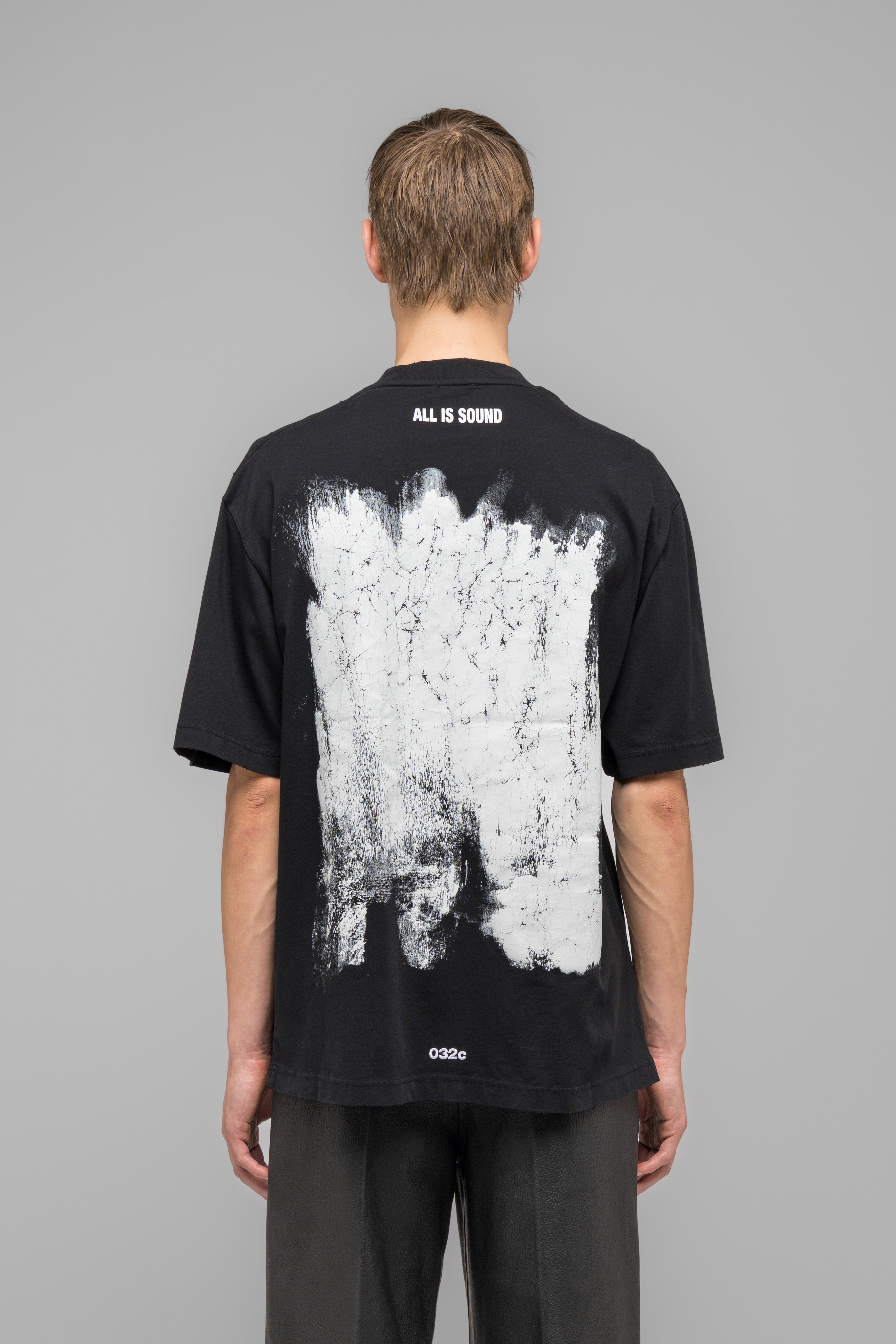The black cotton T-shirt combines a vintage feel with modern details, featuring faded colors, subtle distressing, and a chalky white cracked screen print.