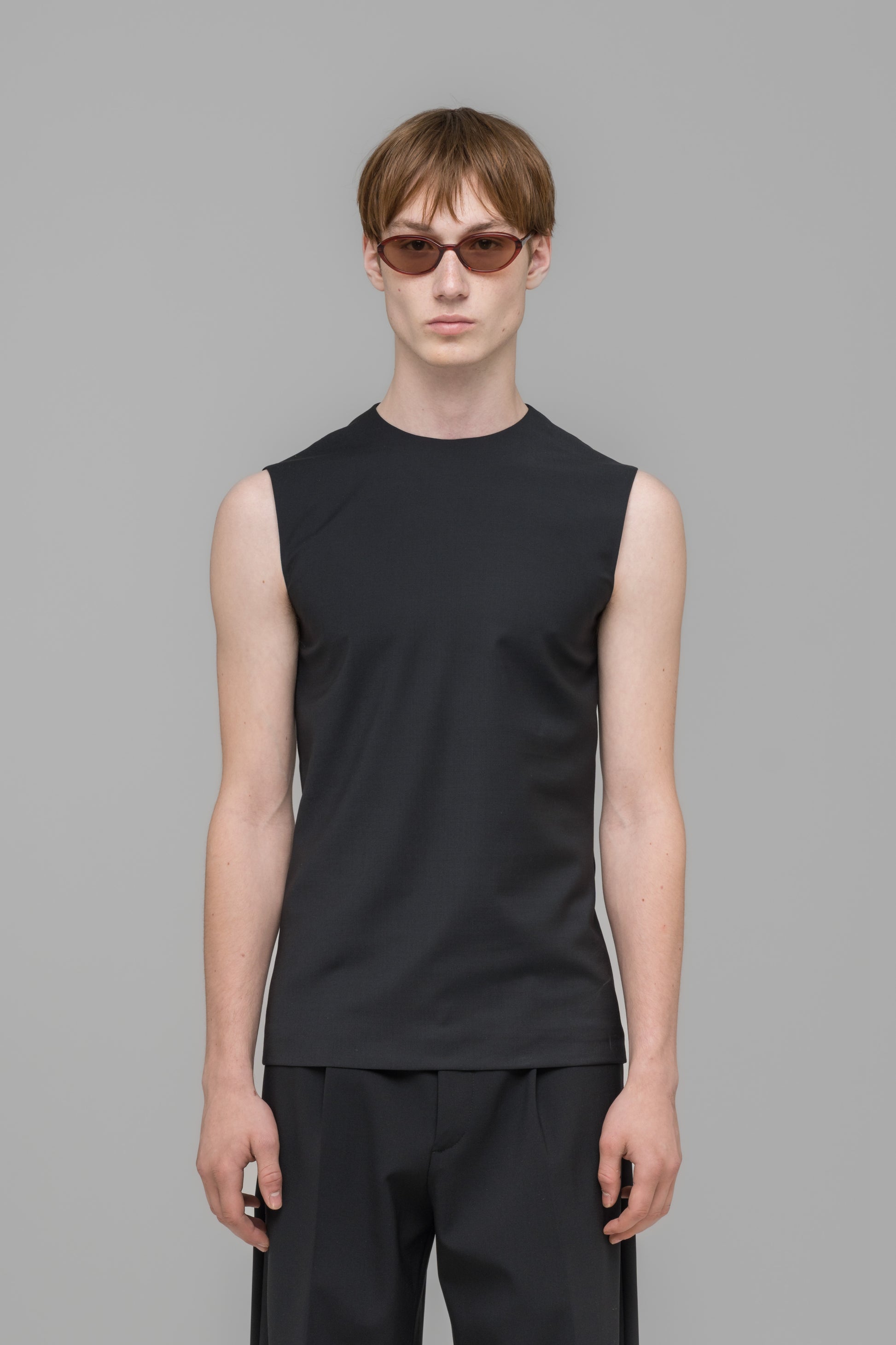 Sleeveless suit top constructed with a cropped hemline for an accentuated modern silhouette. Paired with our small embroidered 032c logo patch.