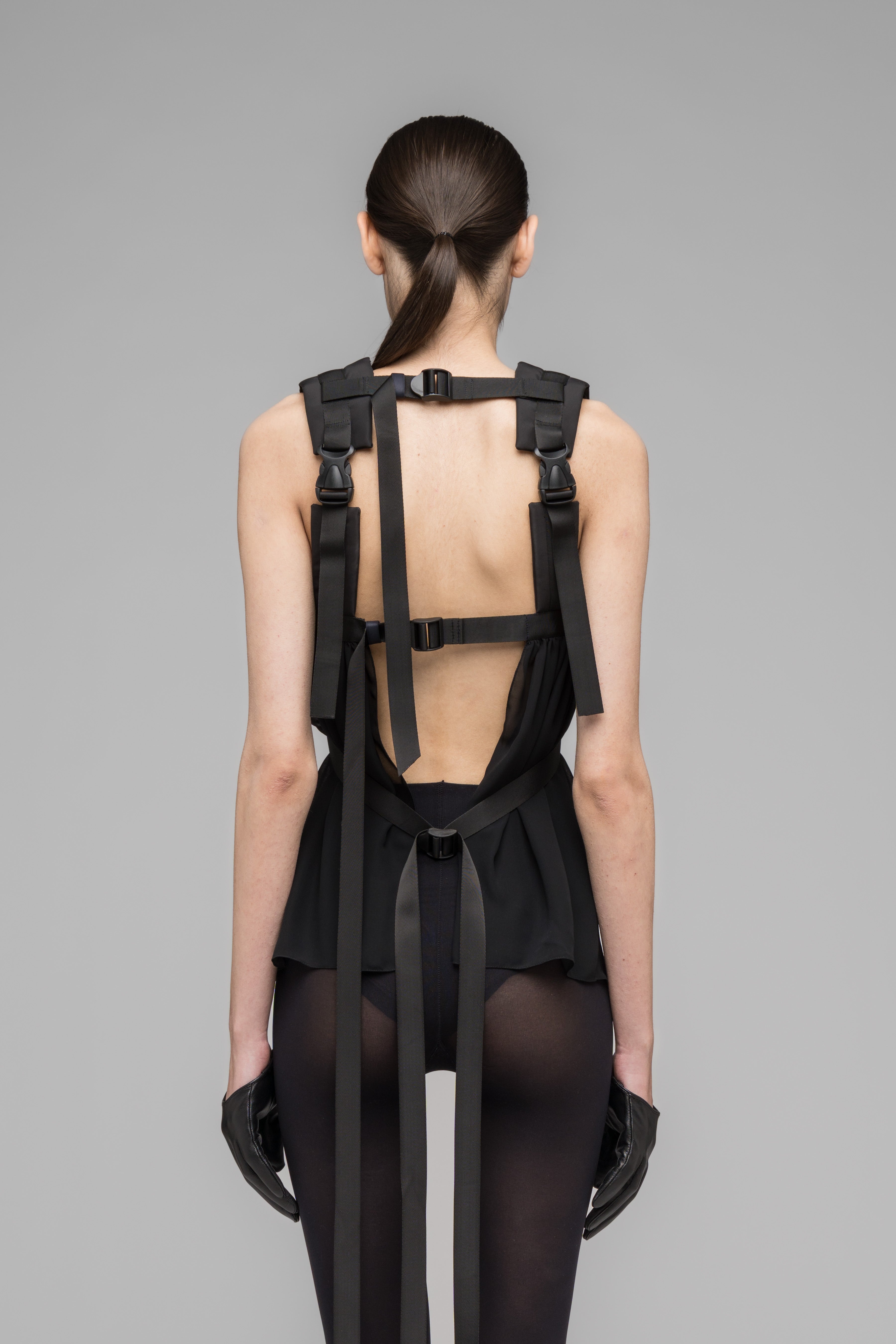 Backpack-style top in lightweight semi-sheer fabric with a slightly crinkled, smooth texture, featuring adjustable straps and a clicker-buckle closure. Made in Germany.