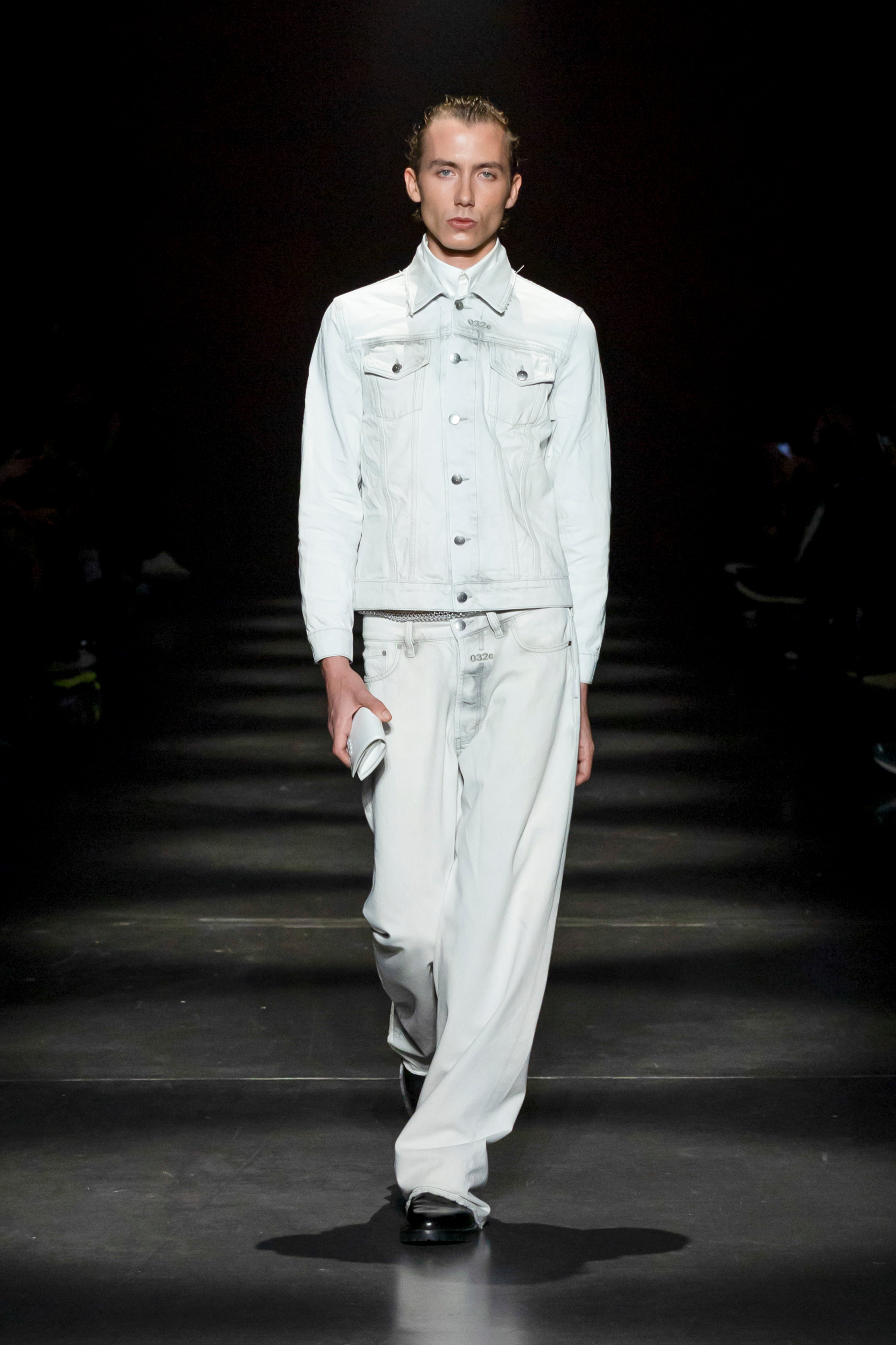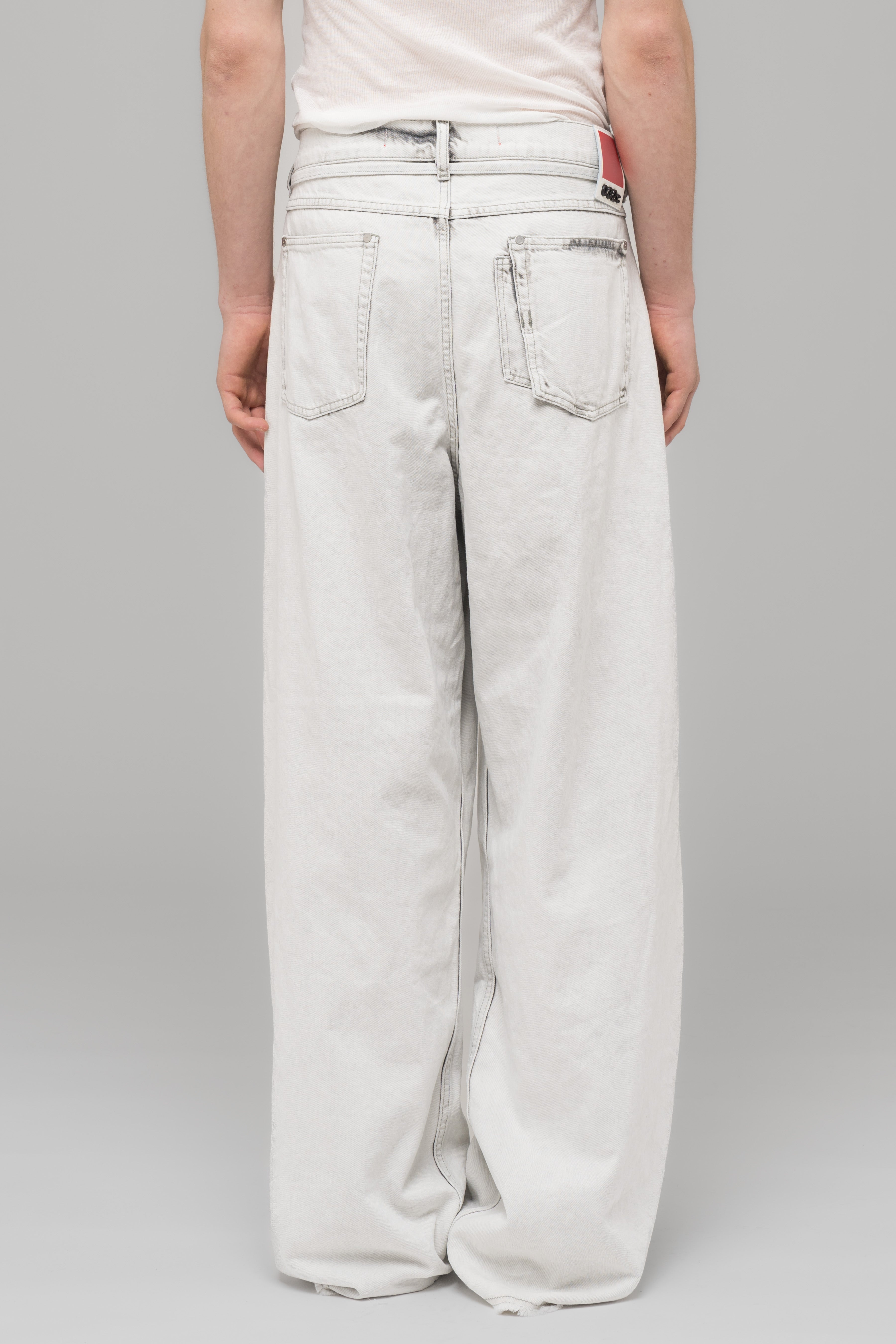 Oversized, low rise loose cut denim pants in white with our seasonal grey stain treatment. Featuring 5 pockets and a tonal logo embroidery paired with a 032c leather patch on the back waistband.