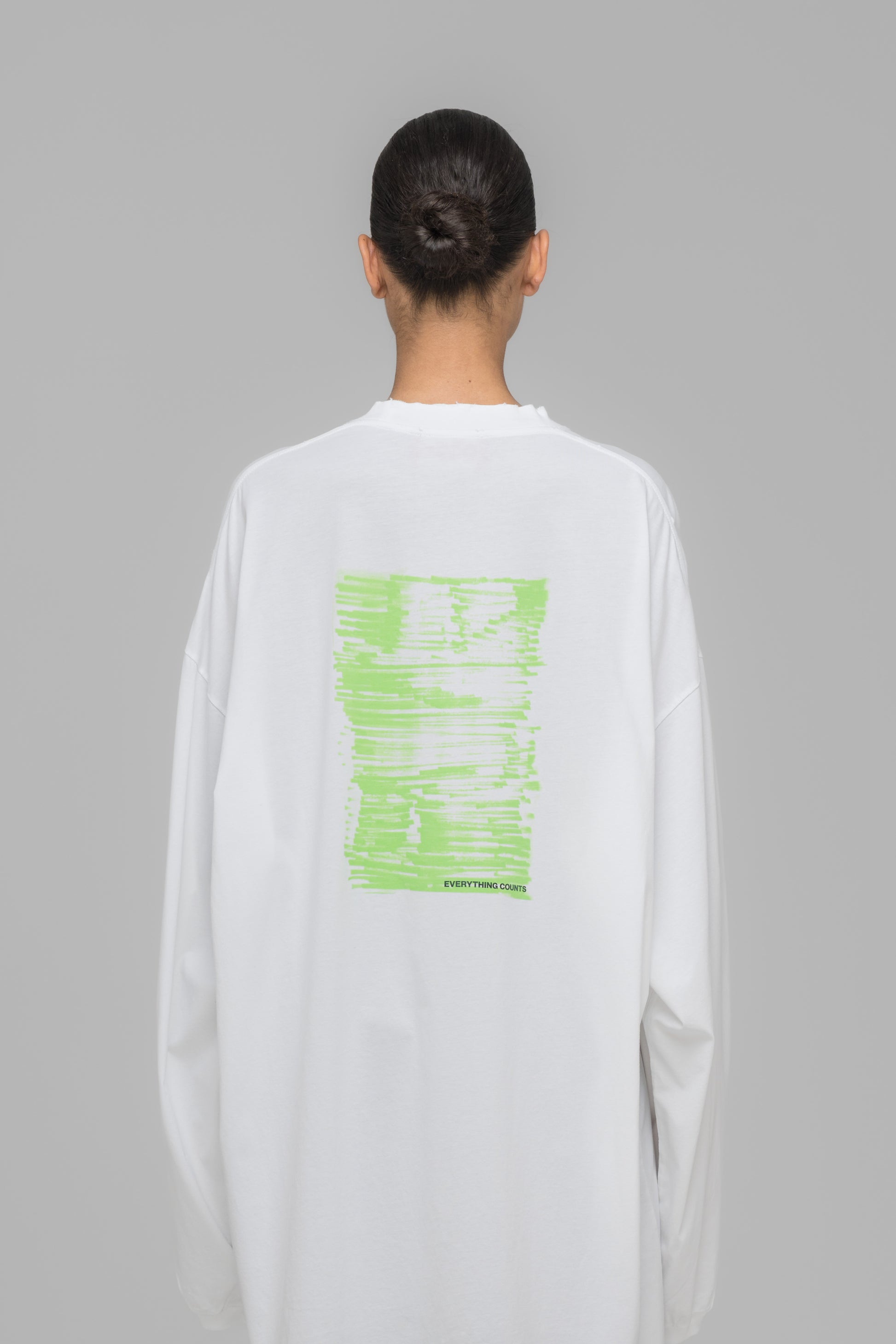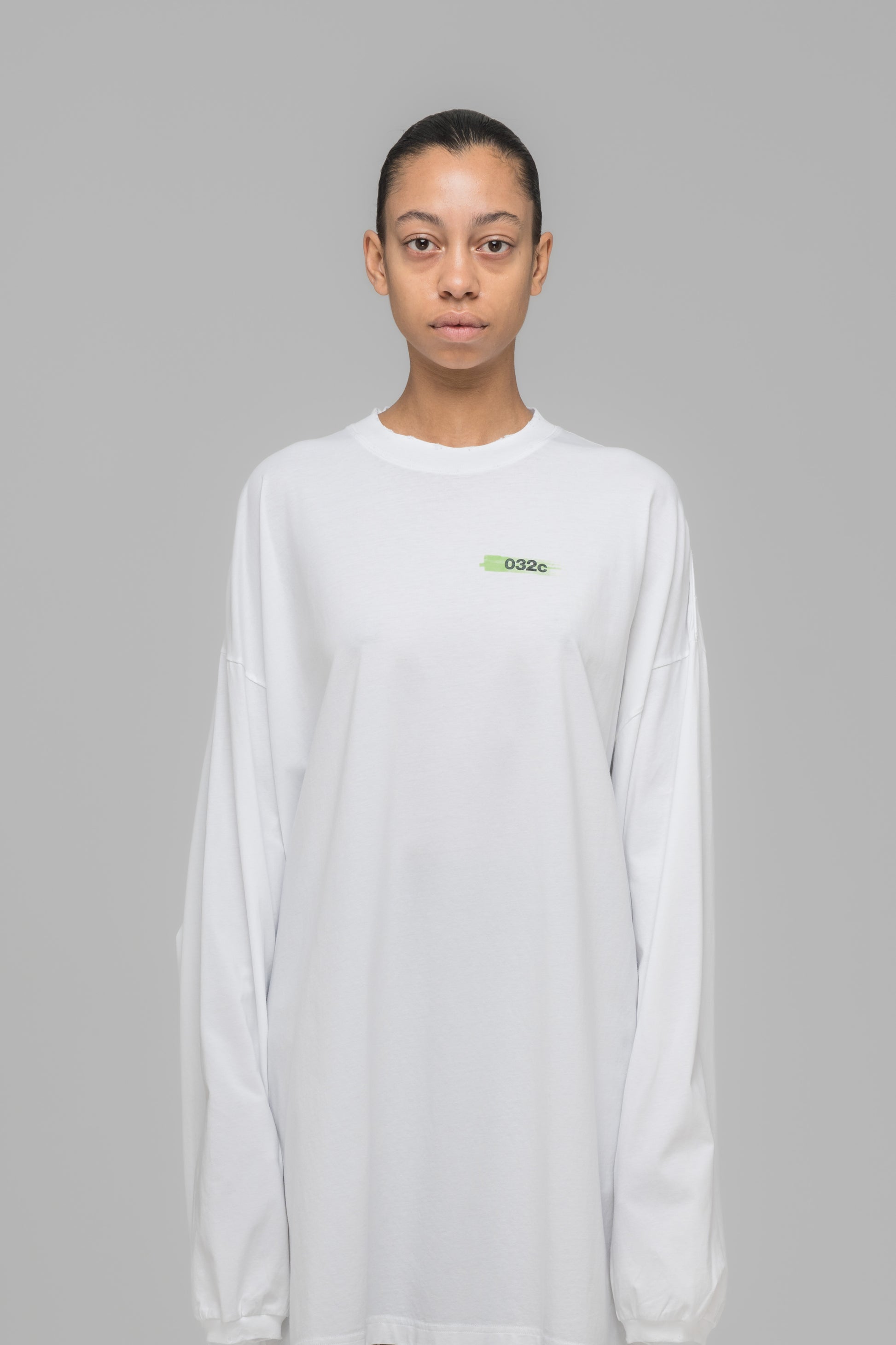 Our oversized longsleeve in white showcases distinct digital print 032c artwork. Distressed slightly for an overall vintage feel.