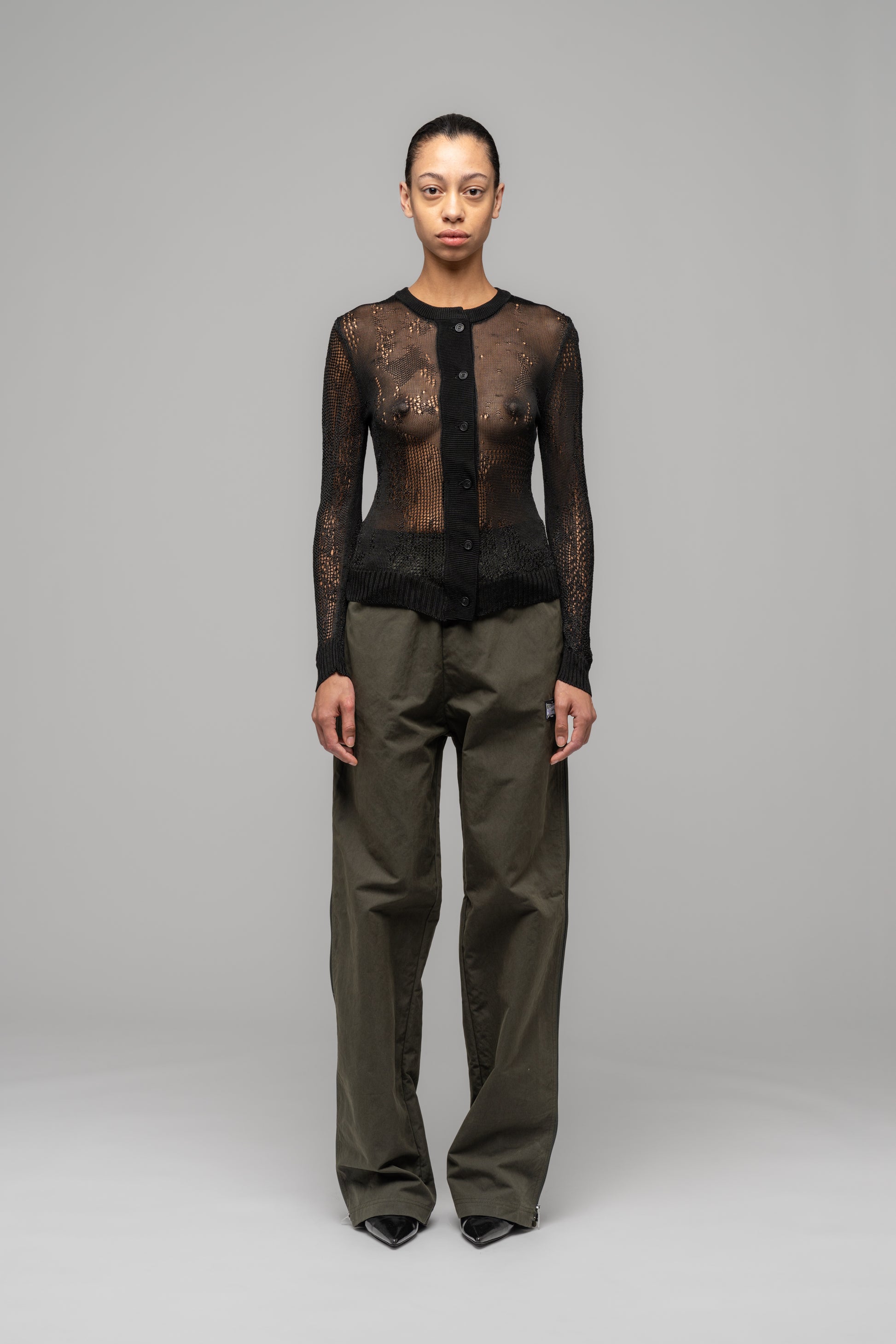 Tight fit knit cardigan with a lace / broken viscose stitch and visible button closure at the front.