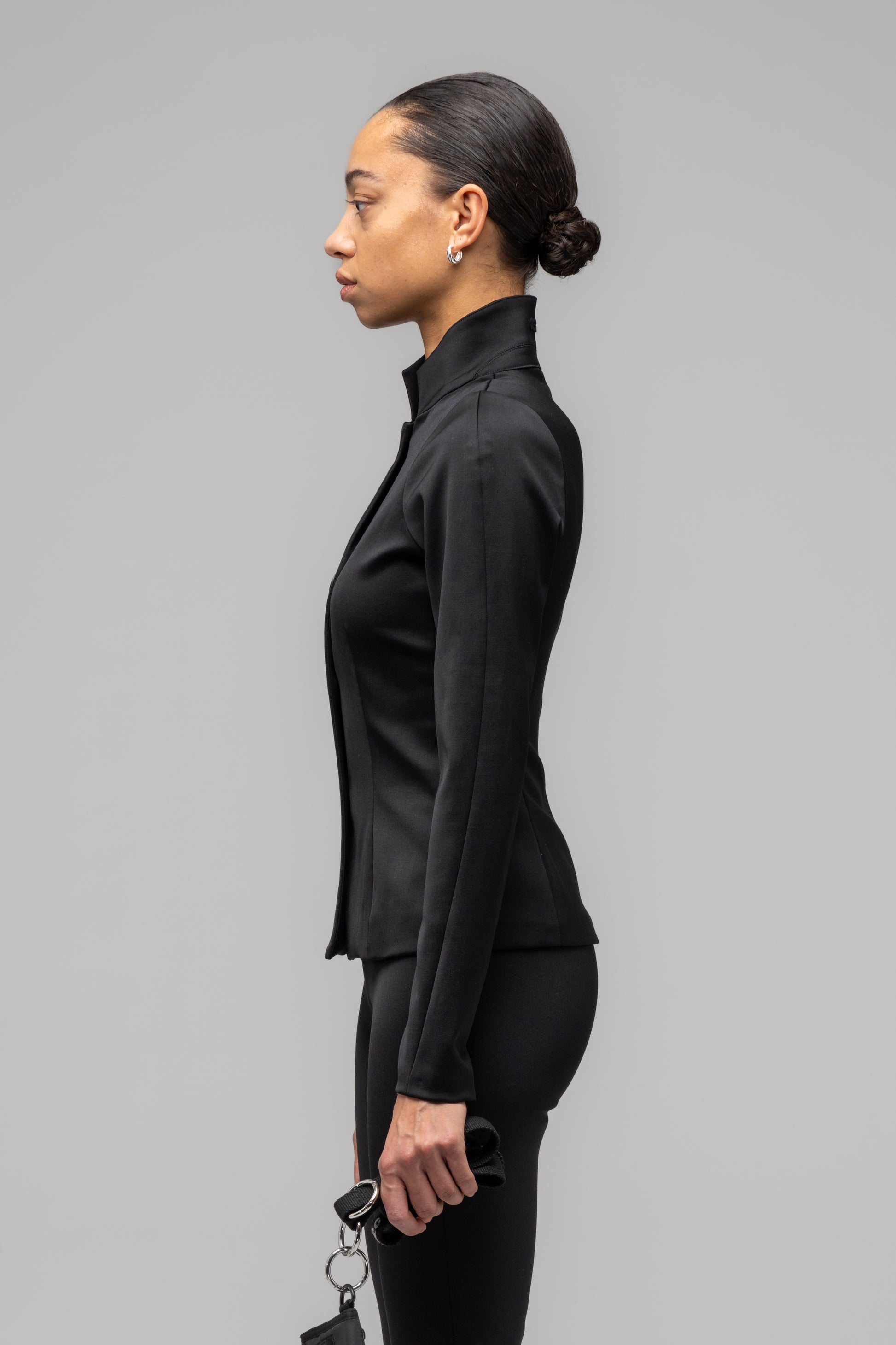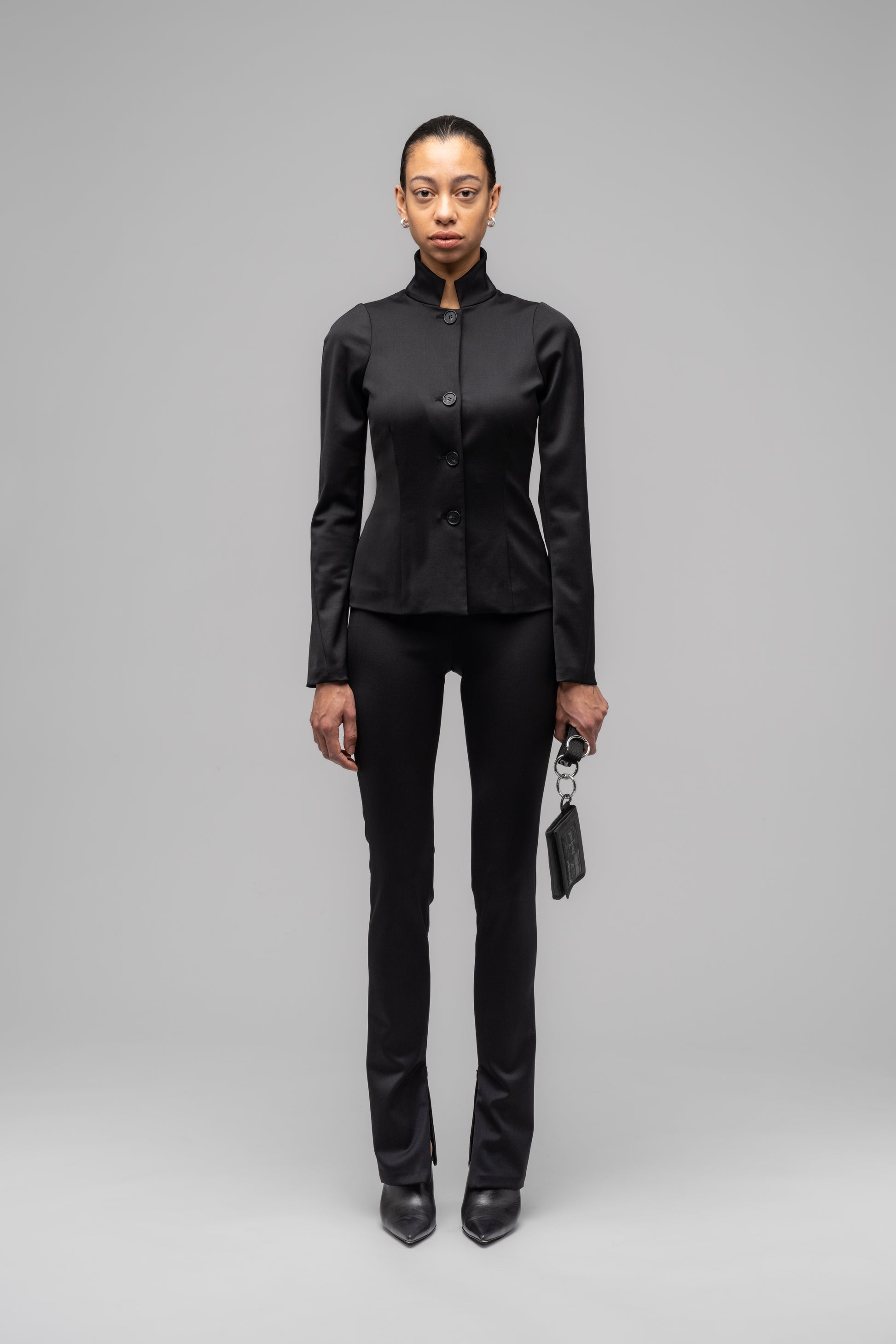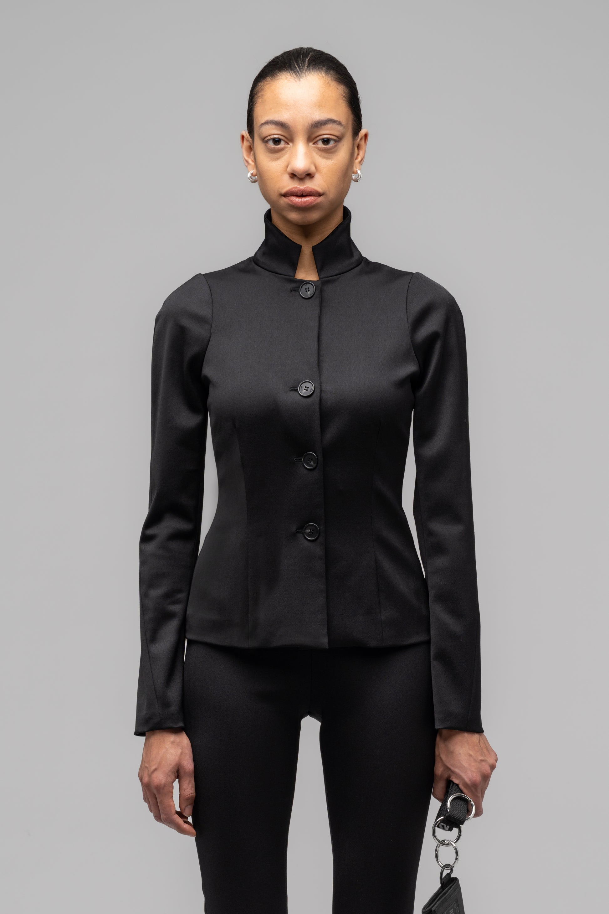 Tight cut suit jacket made from Italian stretch wool with a silky feel. Inward curved armhole detail and top collar closure create a shrunken silhouette. Branded button front closure.