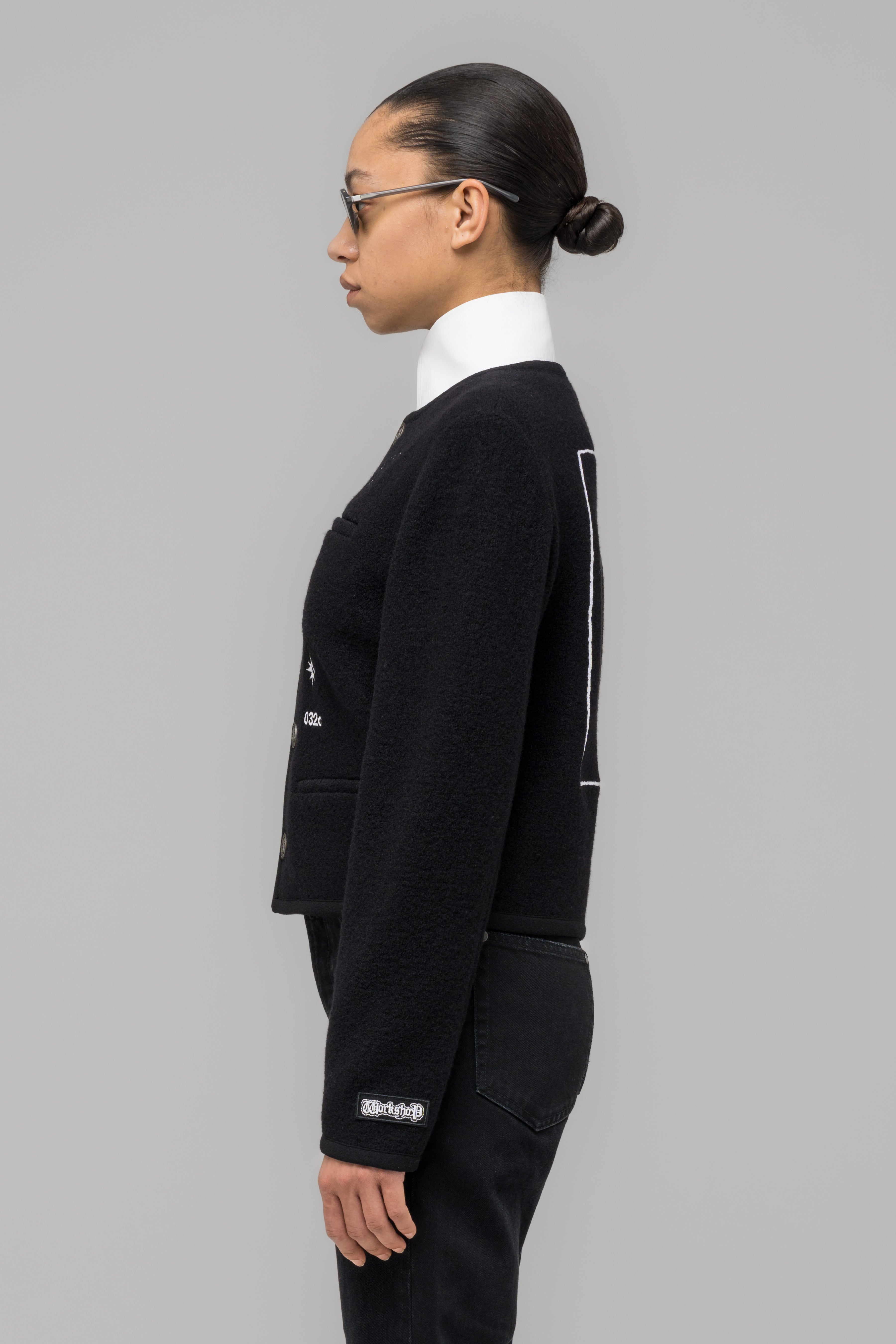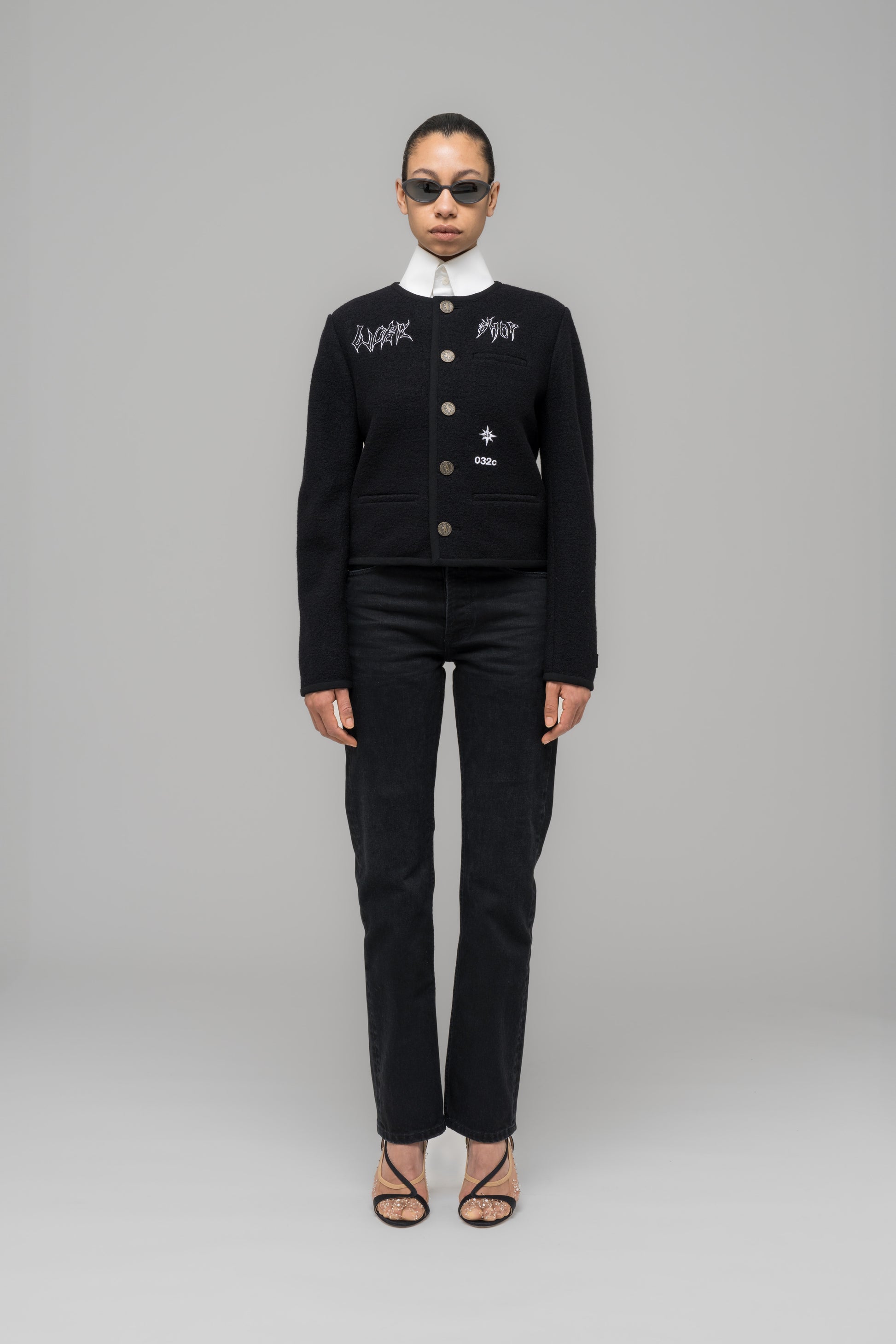 A modern take on a traditional style, crafted in a boiled wool fabric with bound edges and front welt pockets. The janker is equipped with metal branded buttons, 032c logo embroideries and a Workshop patch on the sleeve.