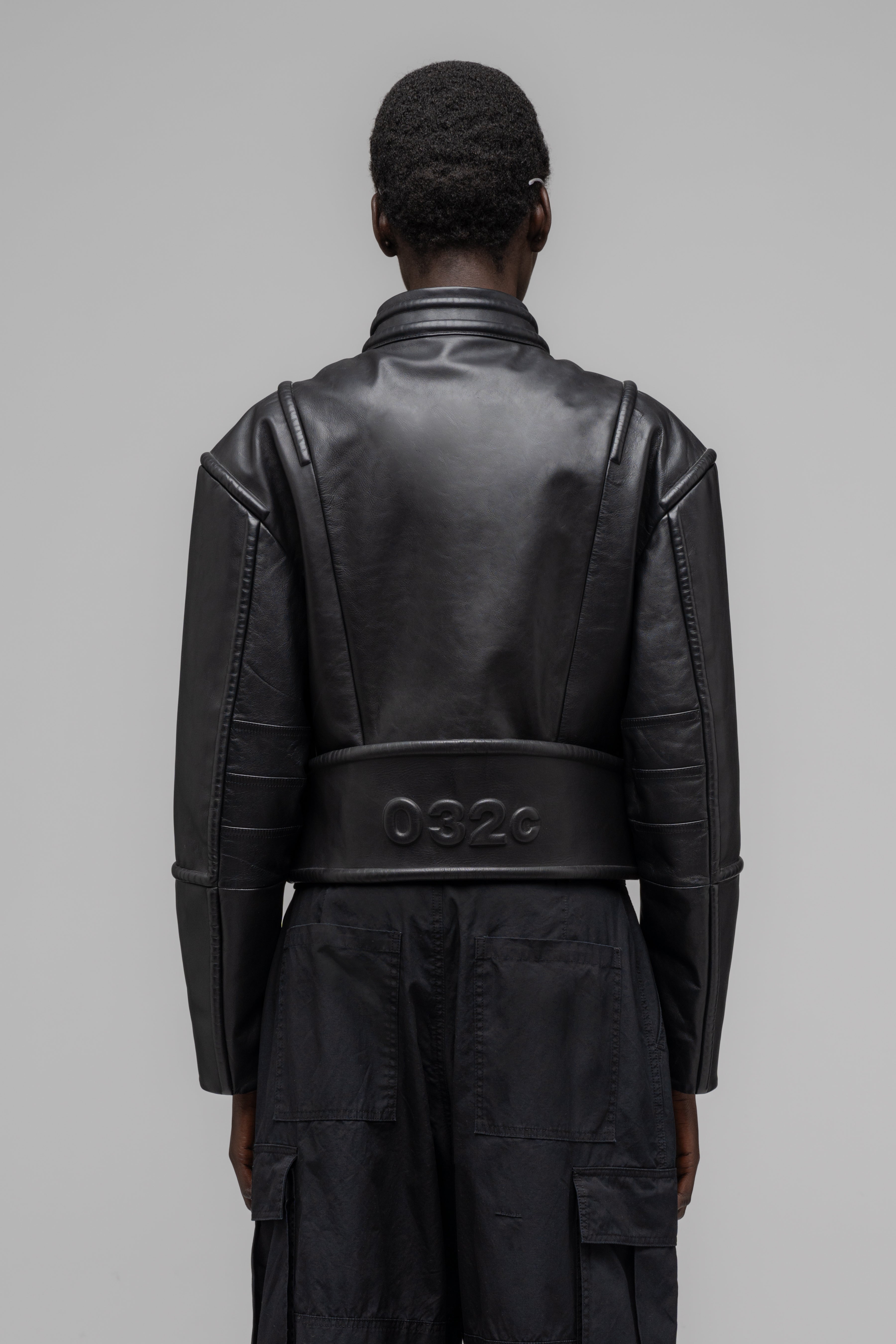 -Debossed 032c logo at zip guard, 3D molded logo at back belt
