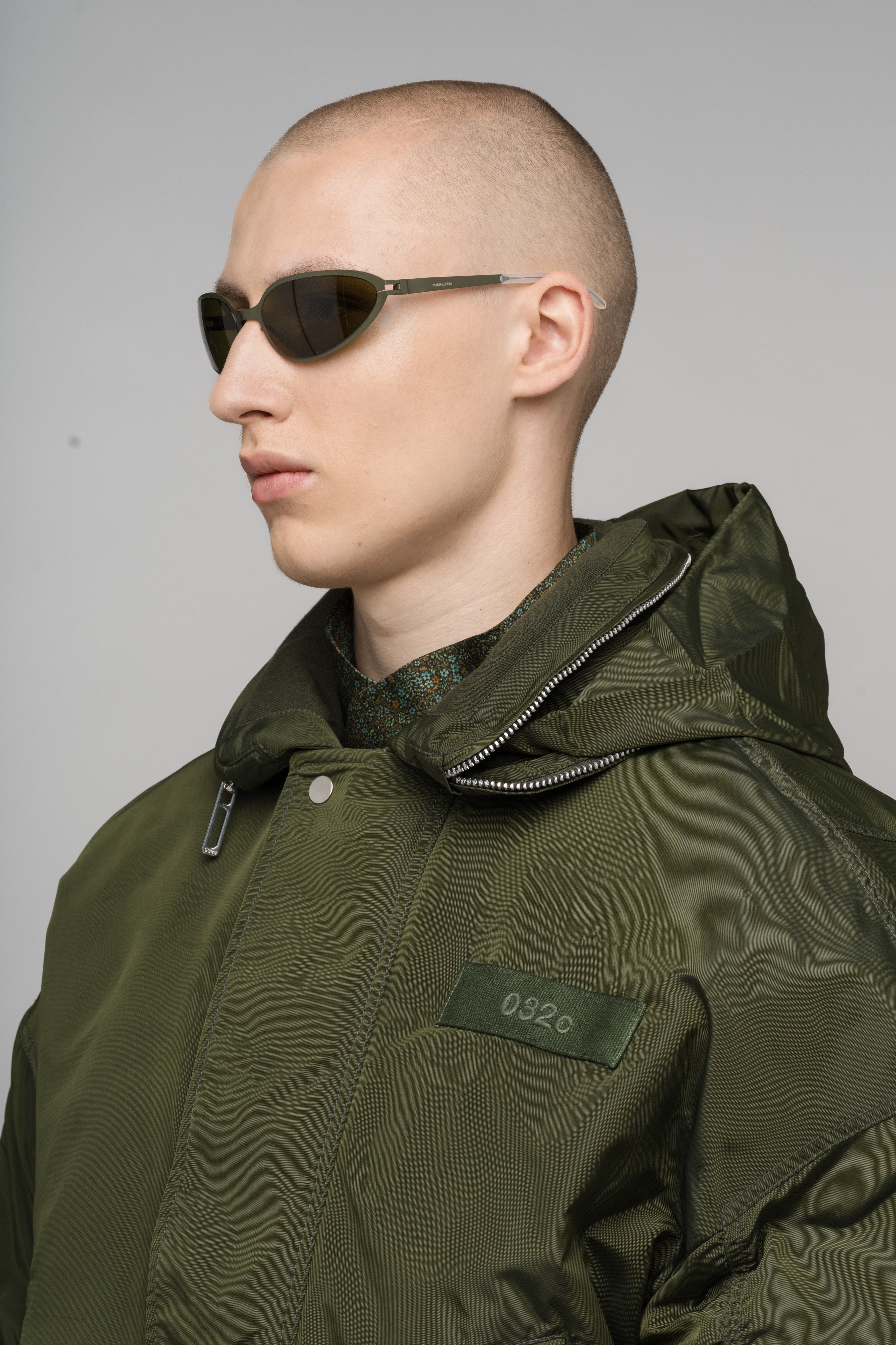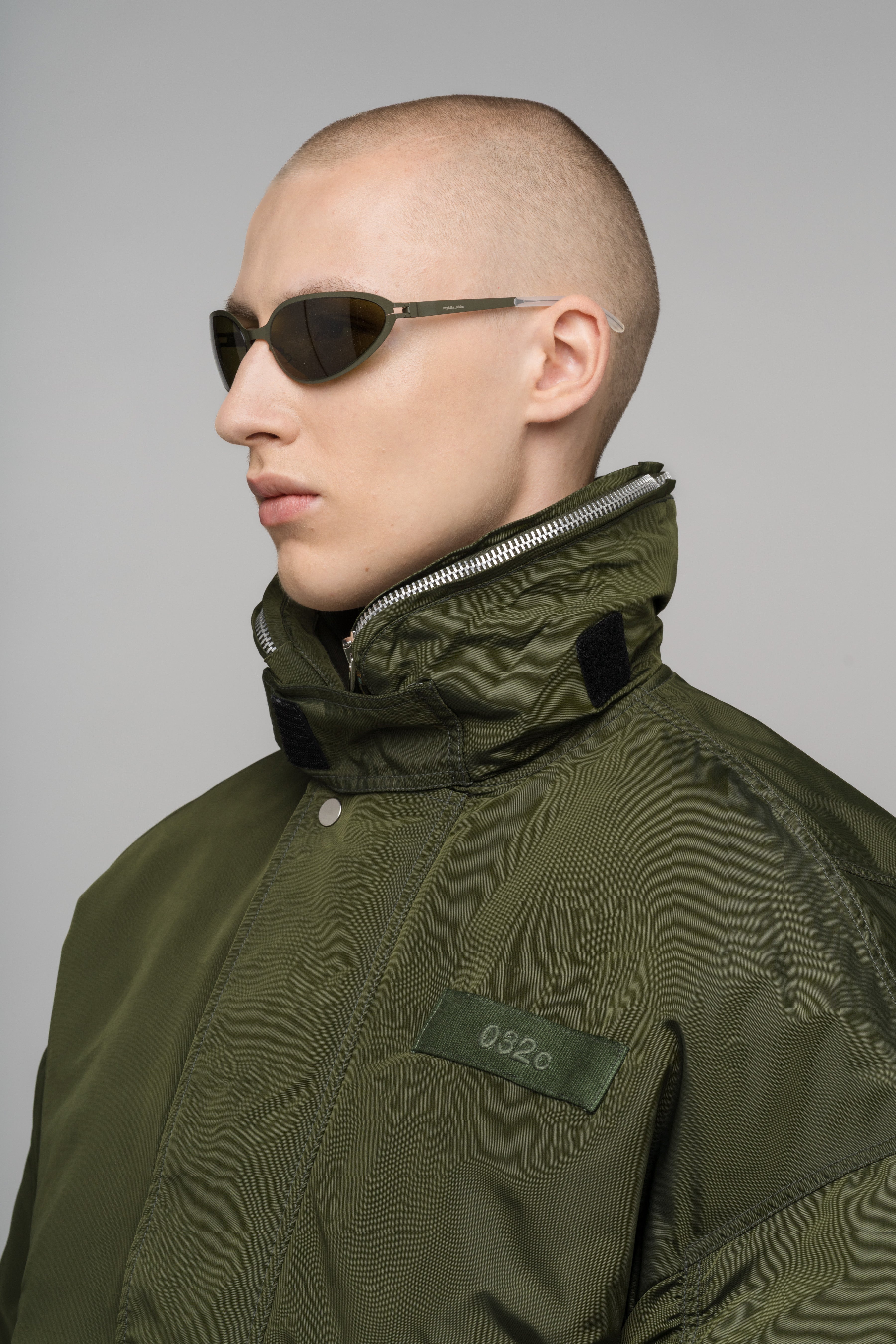 Relaxed-fit bomber jacket in heavy oxford fabric with a two-tone drop-dye effect and water-repellent finish, featuring welt and sleeve pockets, a hidden-hood collar, ribbed cuffs with thumb holes, a branded zip puller, and a 3D embroidered 032c Workshop logo on the back.
