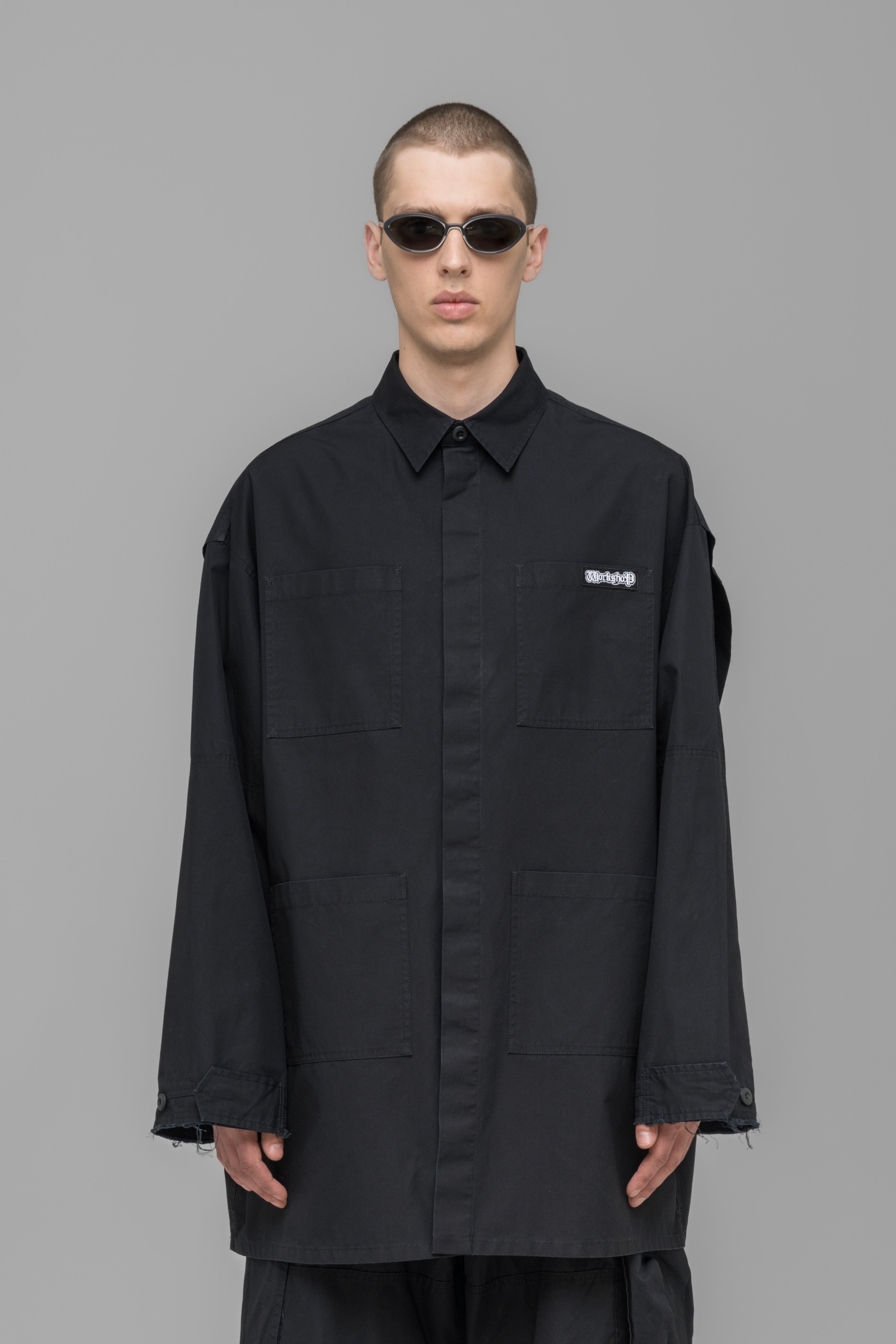 Cargo overshirt with four patch pockets on front, double layer sleeve with raw edge, two button sleeve adjusters and shoulders are constructed with a pleat. Equipped with a woven label on the chest patch pocket and a seasonal artwork screenprint on the back.