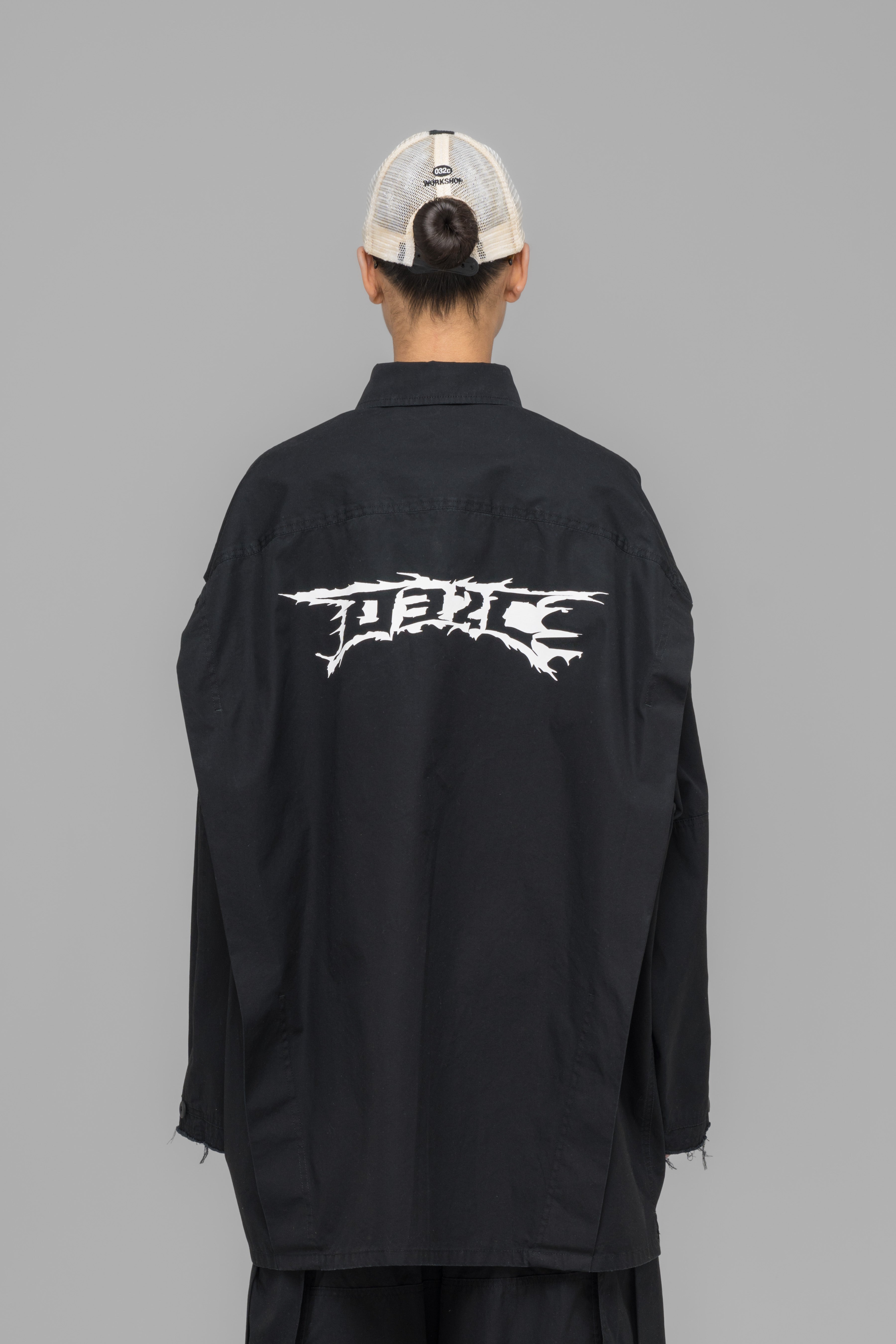 Cargo overshirt with four patch pockets on front, double layer sleeve with raw edge, two button sleeve adjusters and shoulders are constructed with a pleat. Equipped with a woven label on the chest patch pocket and a seasonal artwork screenprint on the back.