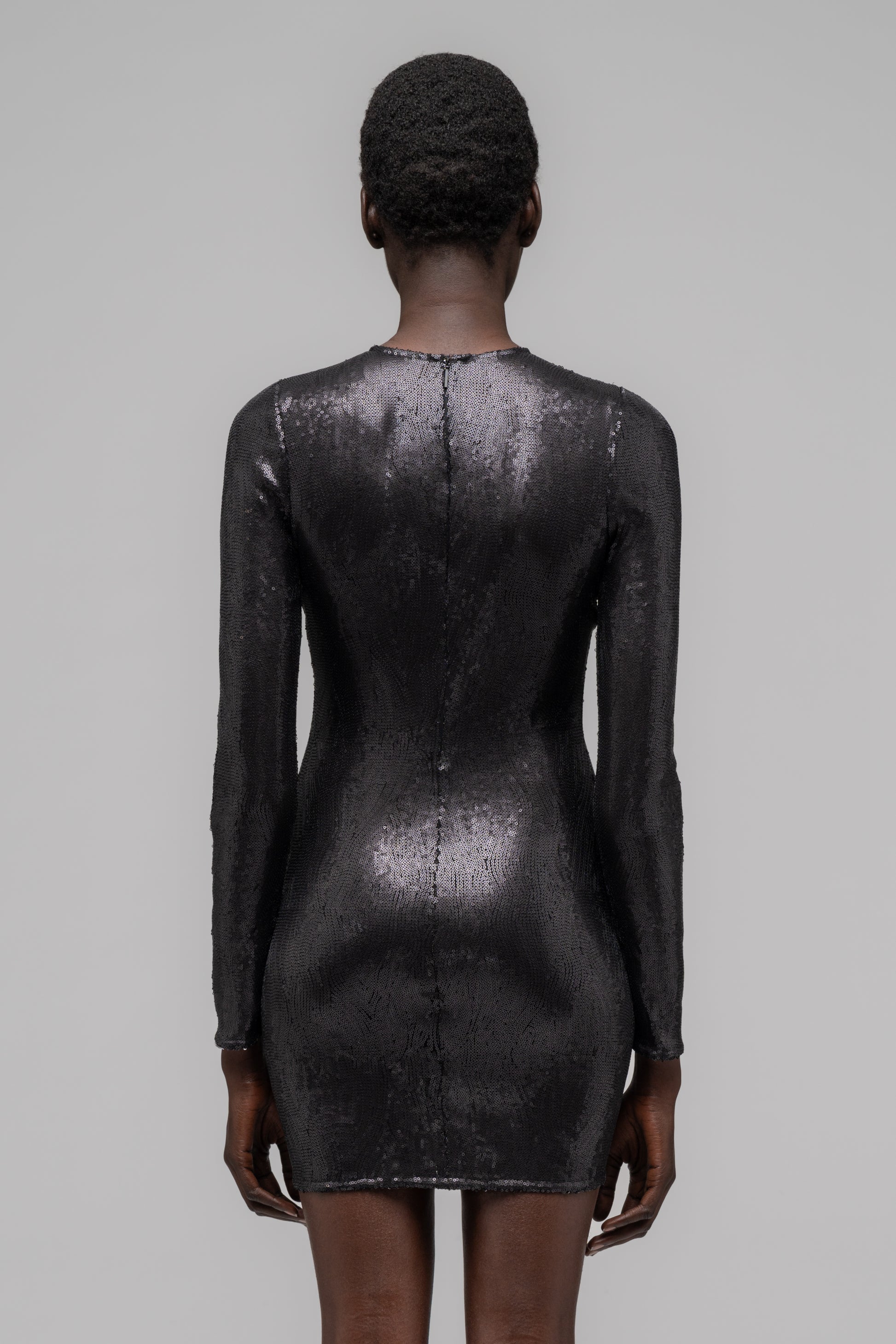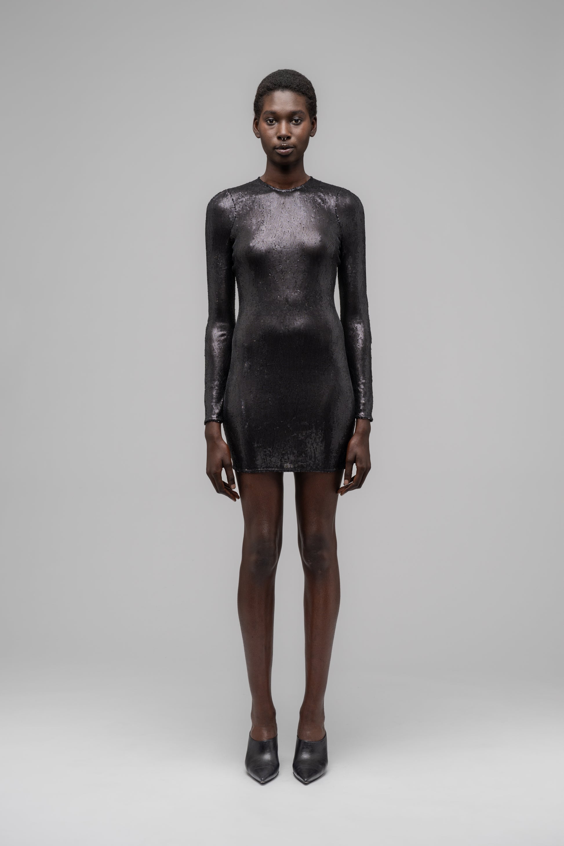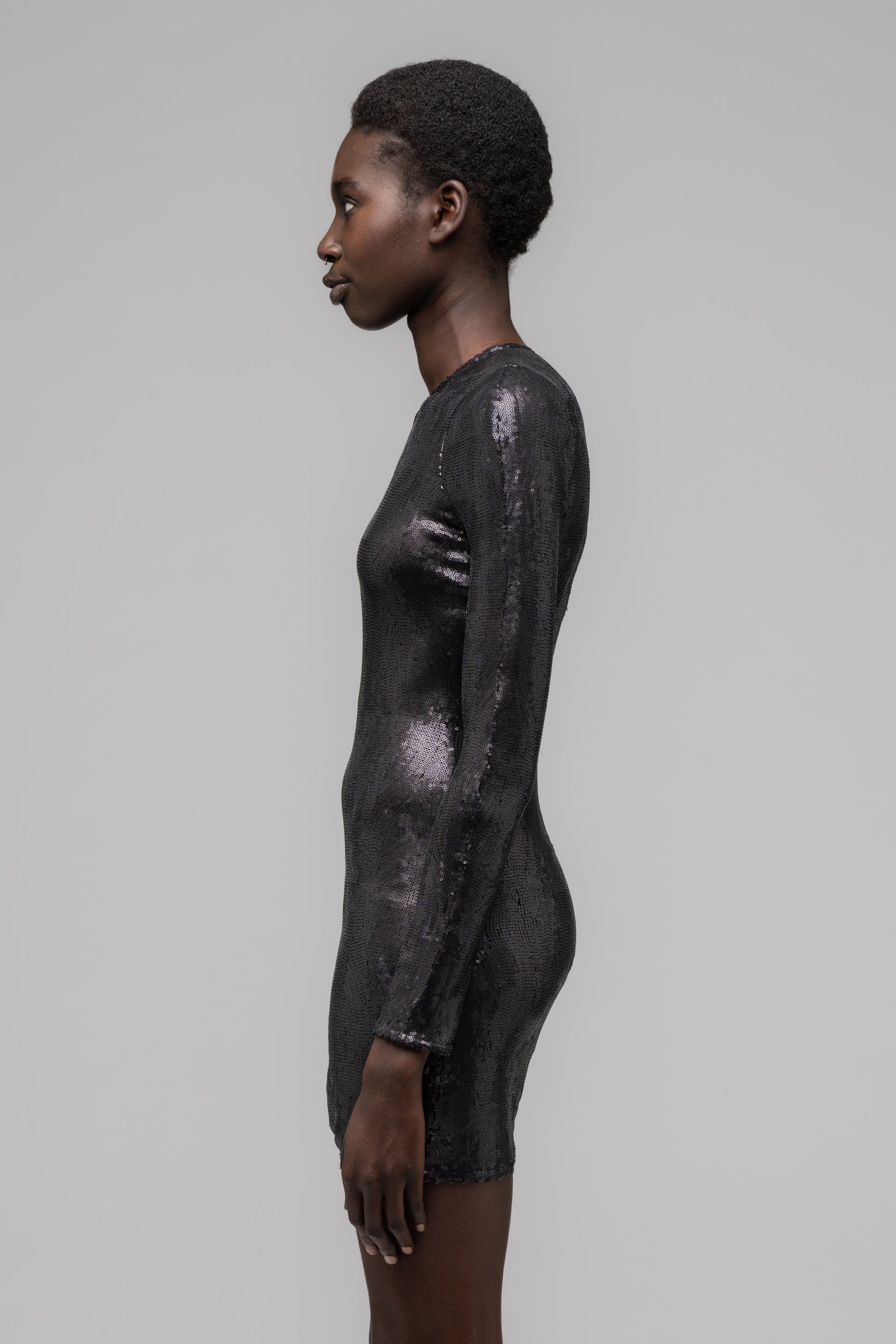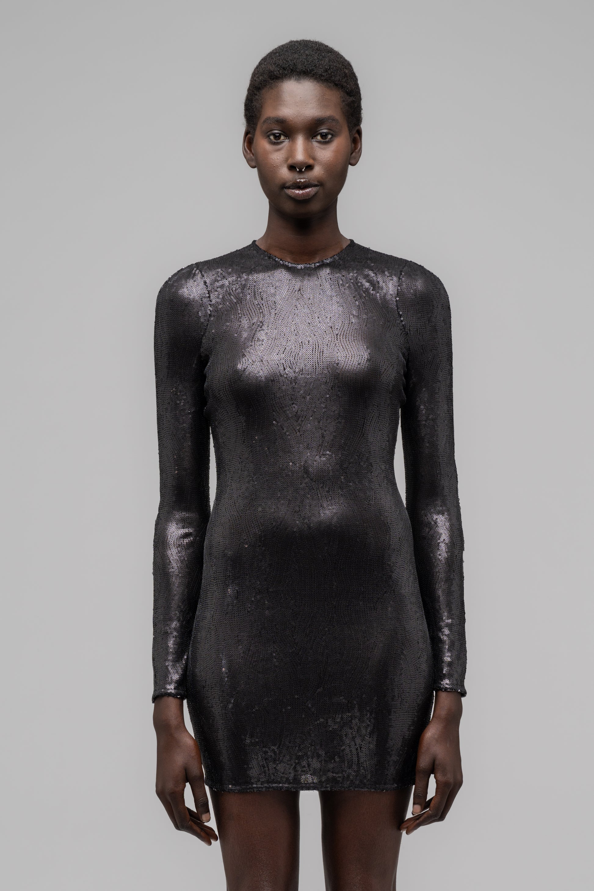 Tight fit longsleeve mini dress made out of sequined spandex mesh. Inward curved armhole detail creates a shrunken silhouette. Concealed zipper at the back.