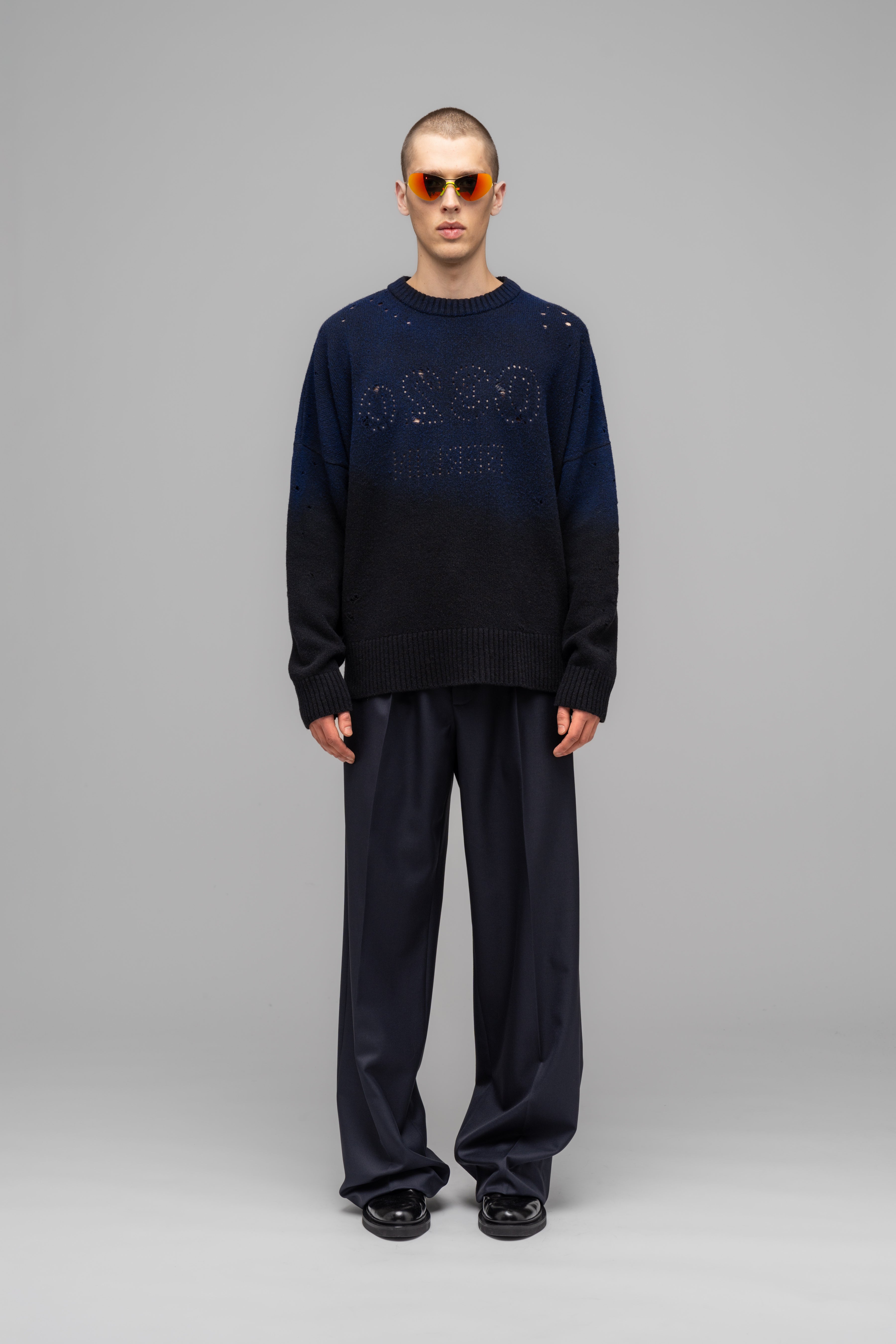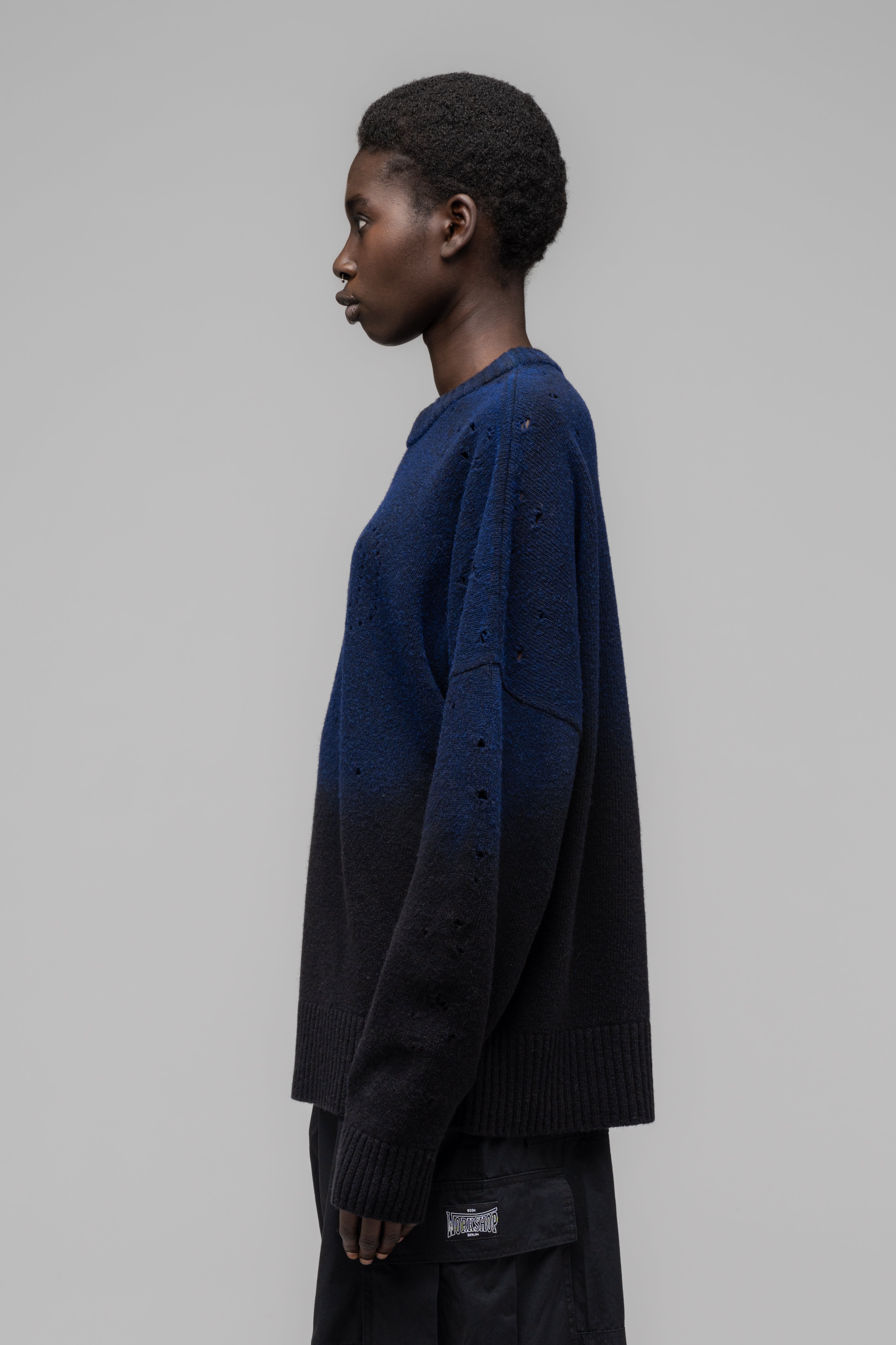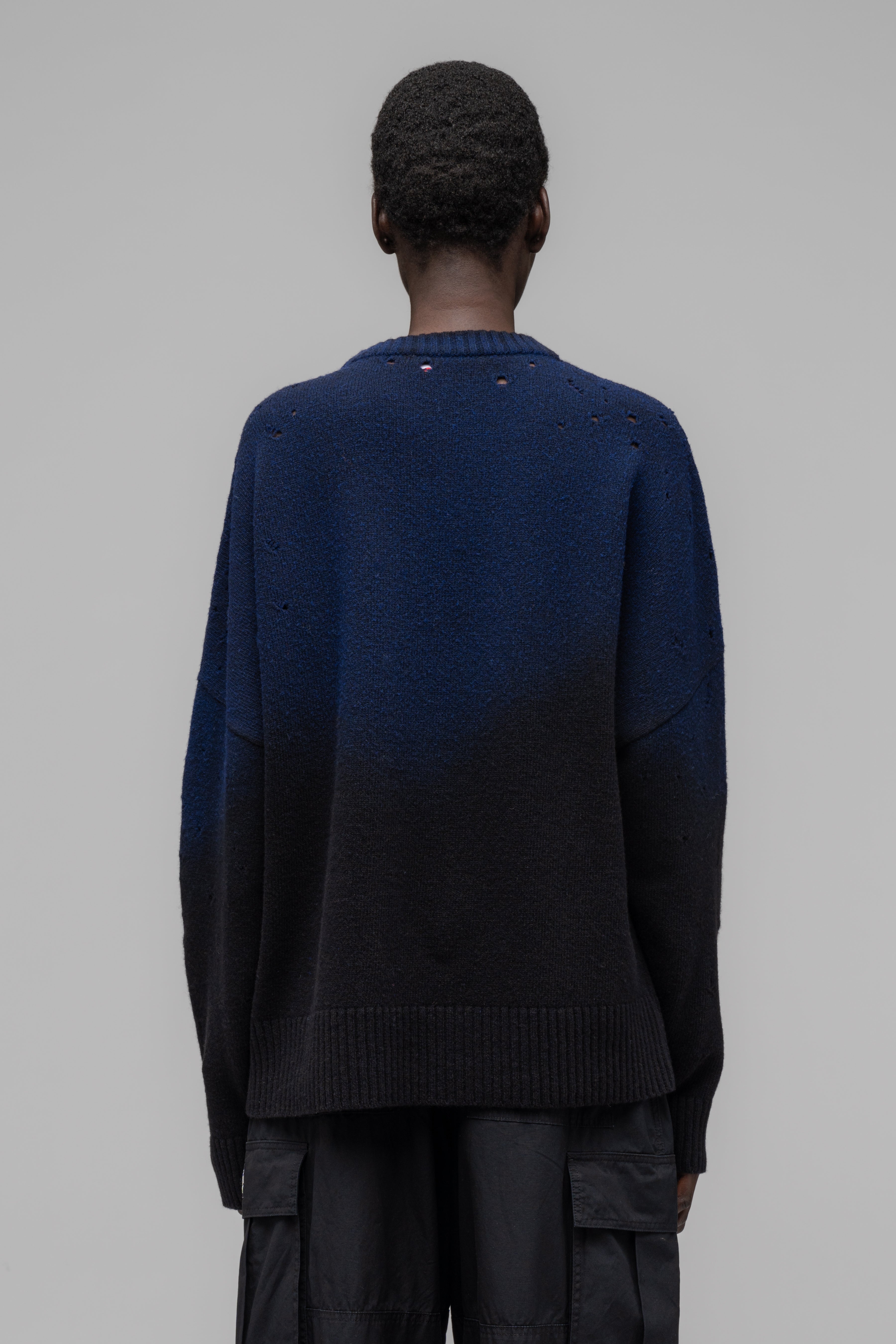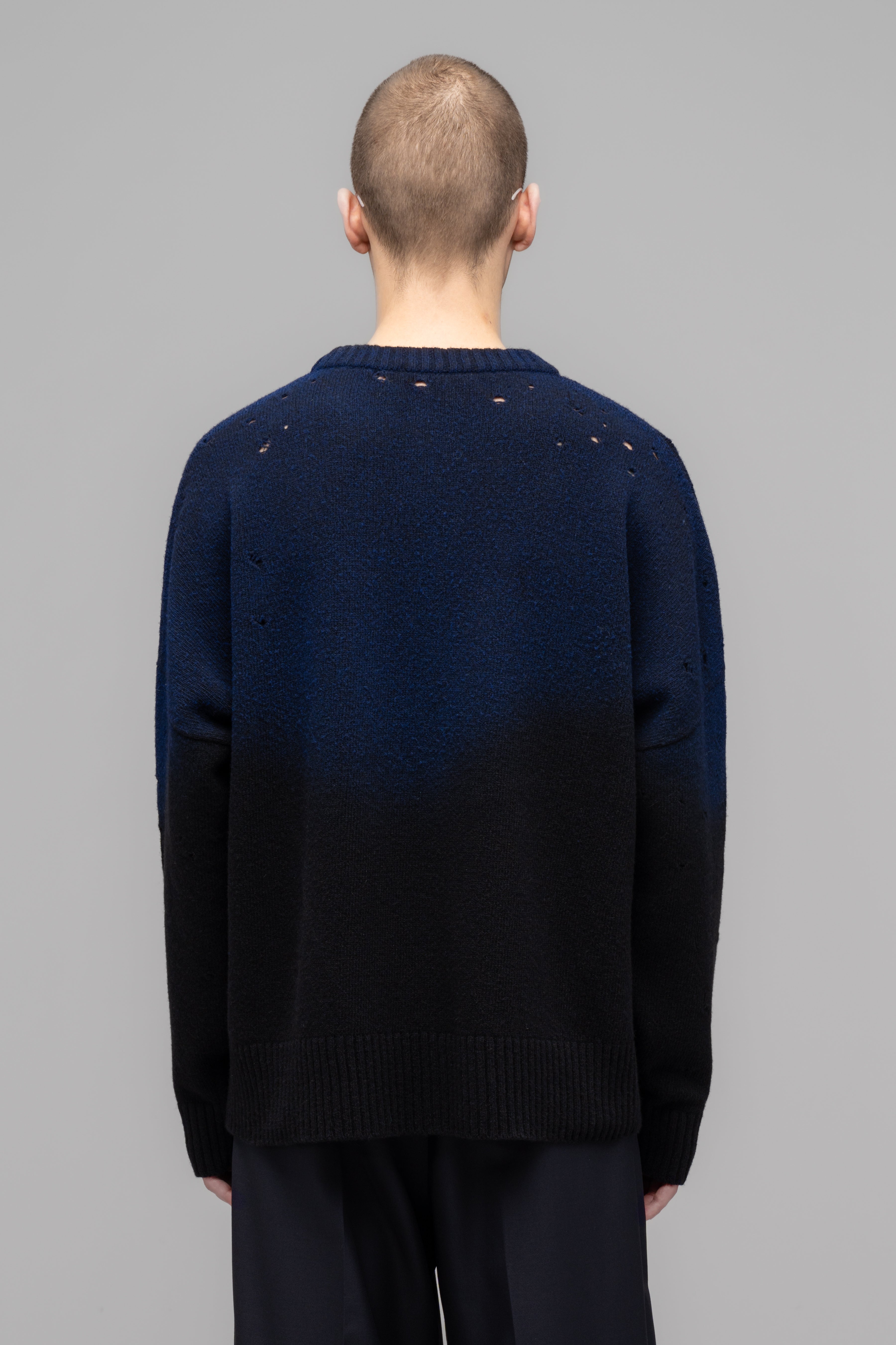 Seasonal variation of our all-time favorite sweater, made from extrafine wool yarn. Dark blue spray treatment on the top section creates a color gradient towards the hem. Distressing at the top and sleeves.