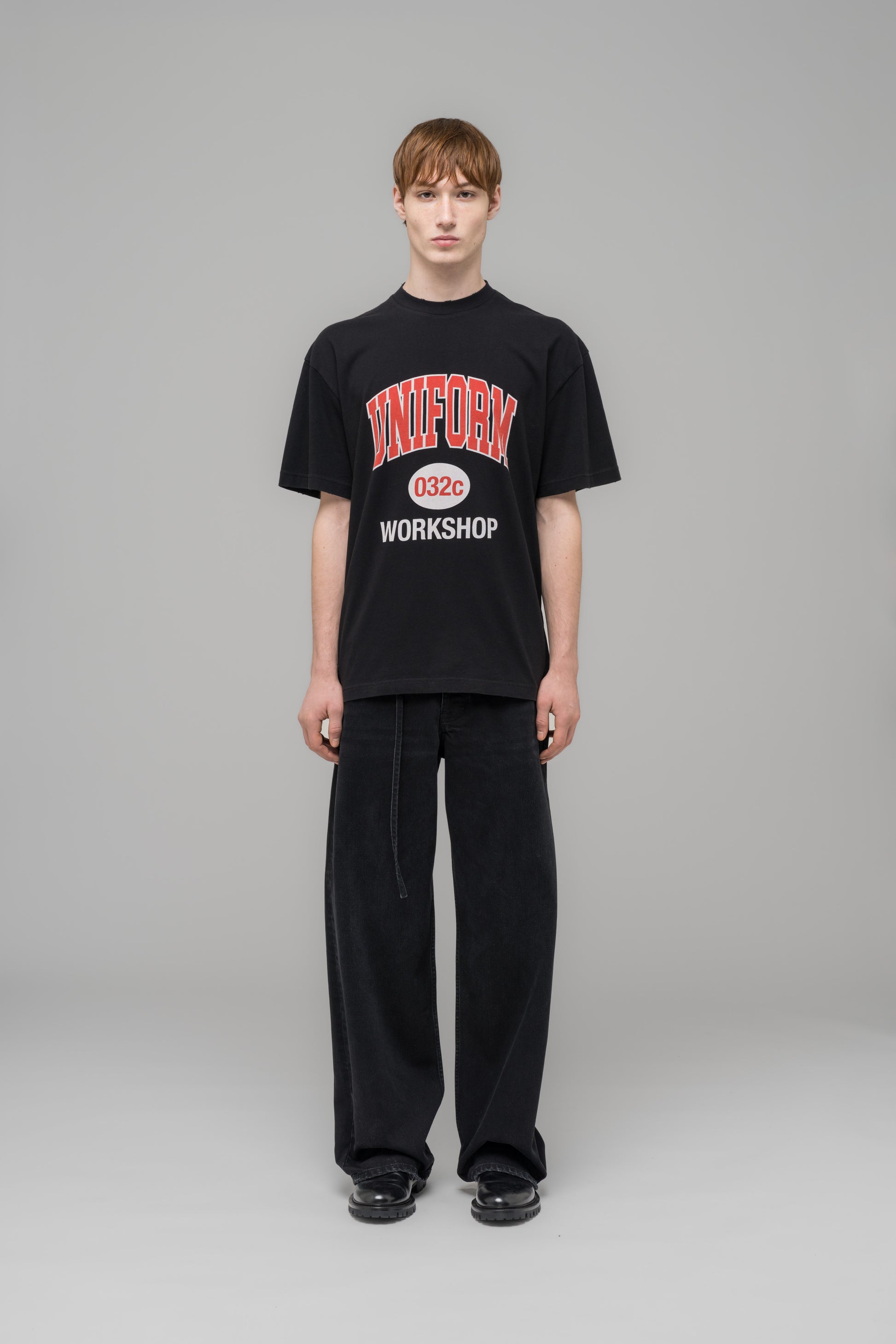 Regular-cut t-shirt in washed black with screen printed "LUCKY STRIKE" artwork on front and a tonal embroidered 032c logo at the back above hem. Heavily washed and lightly distressed for a vintage feel.