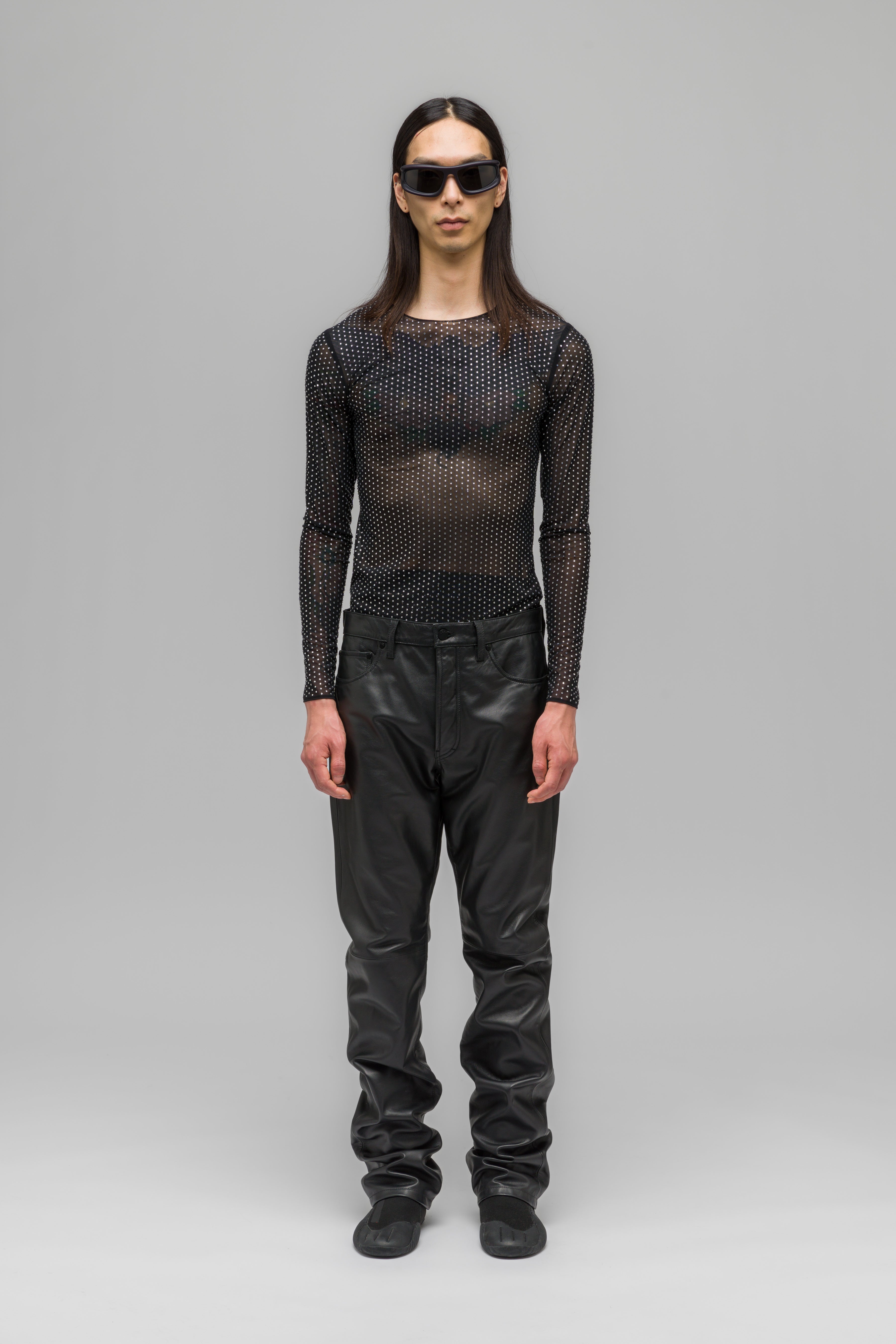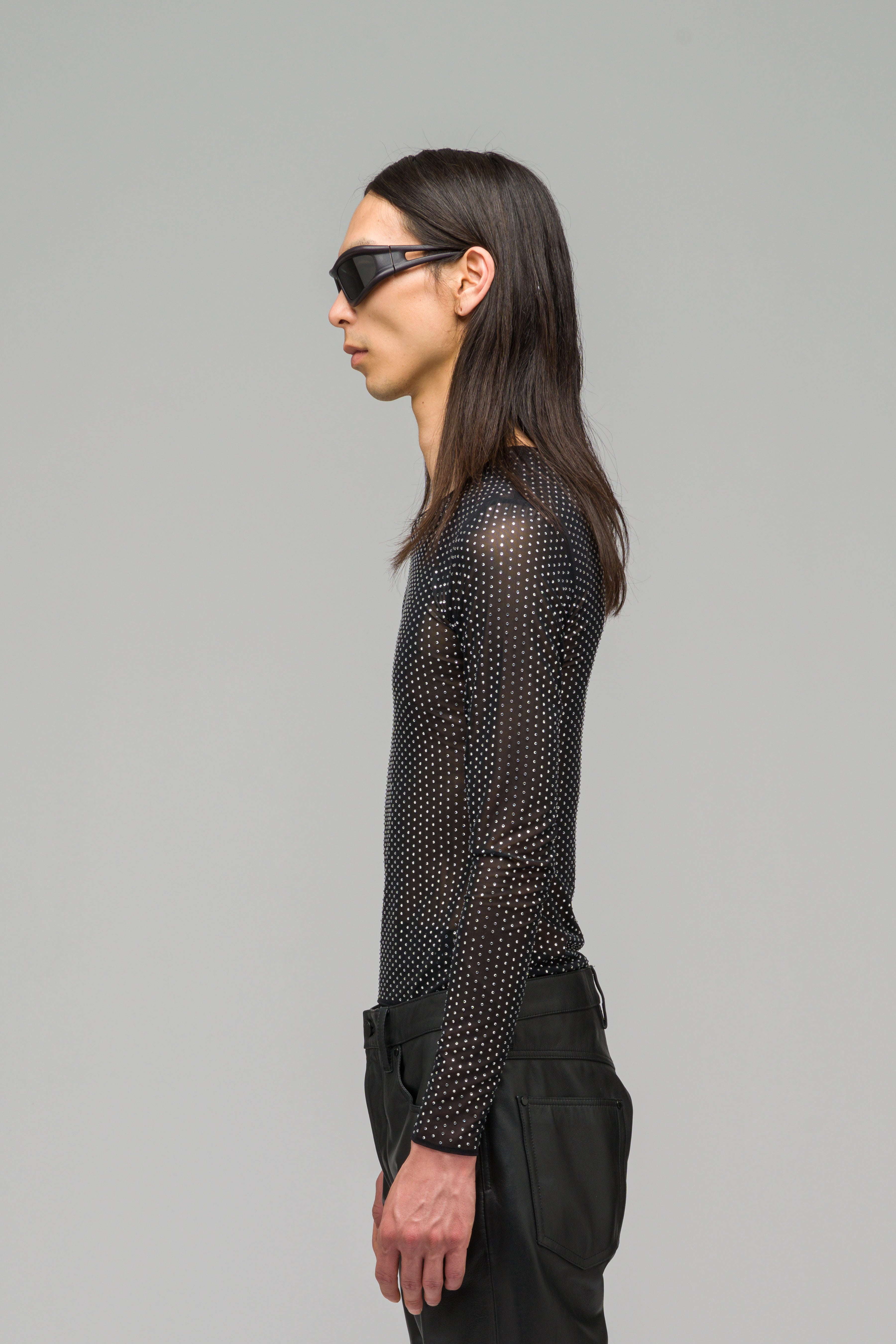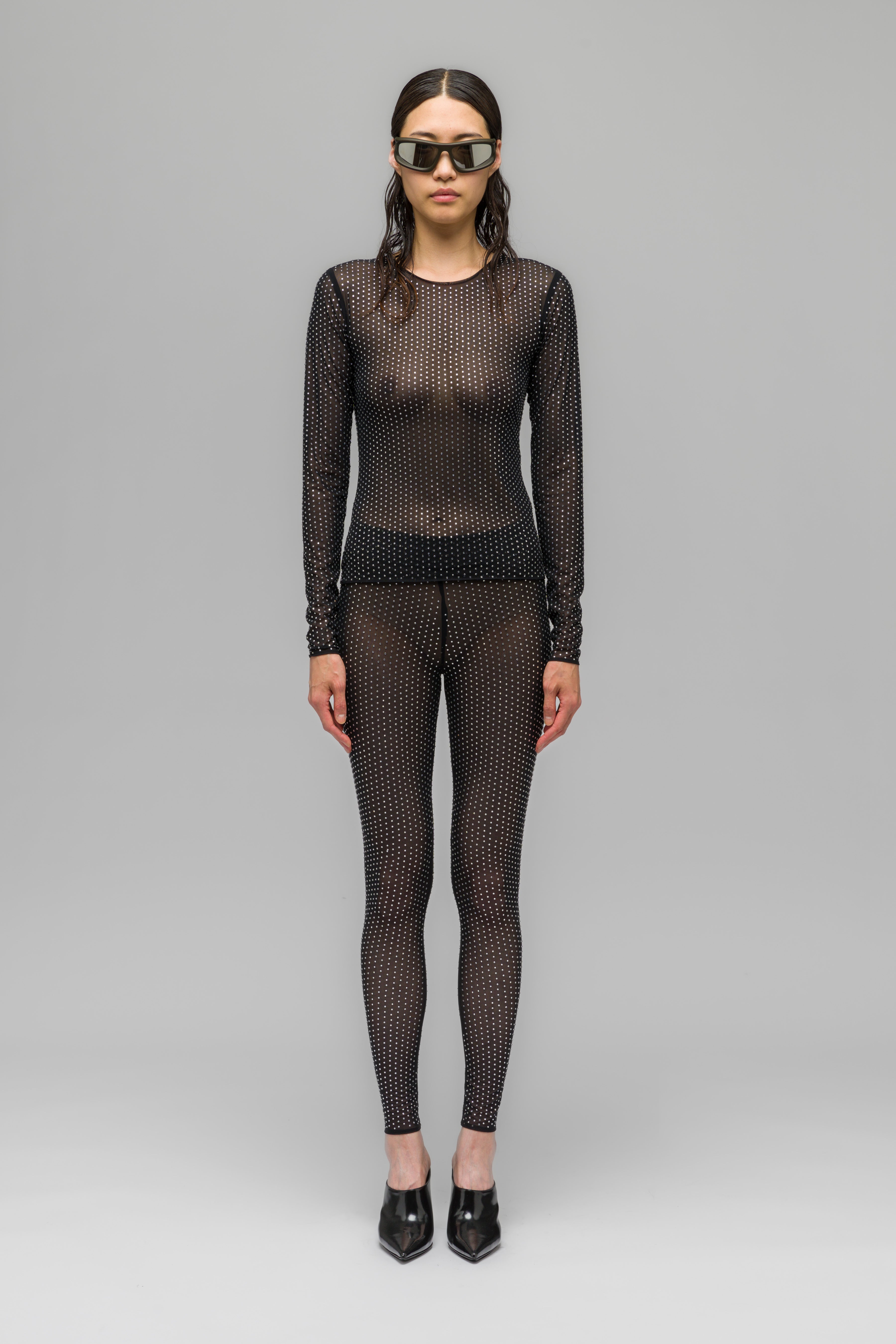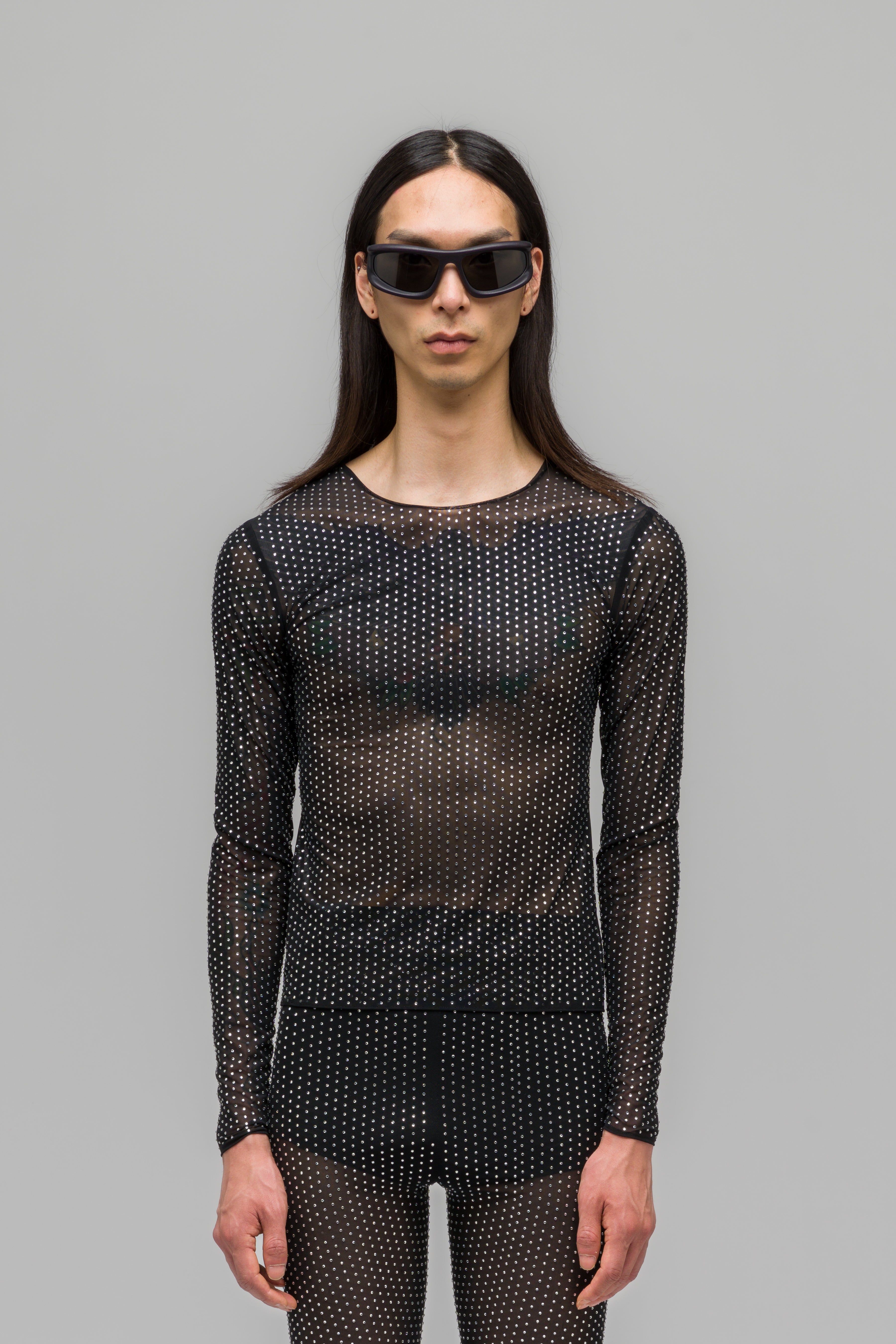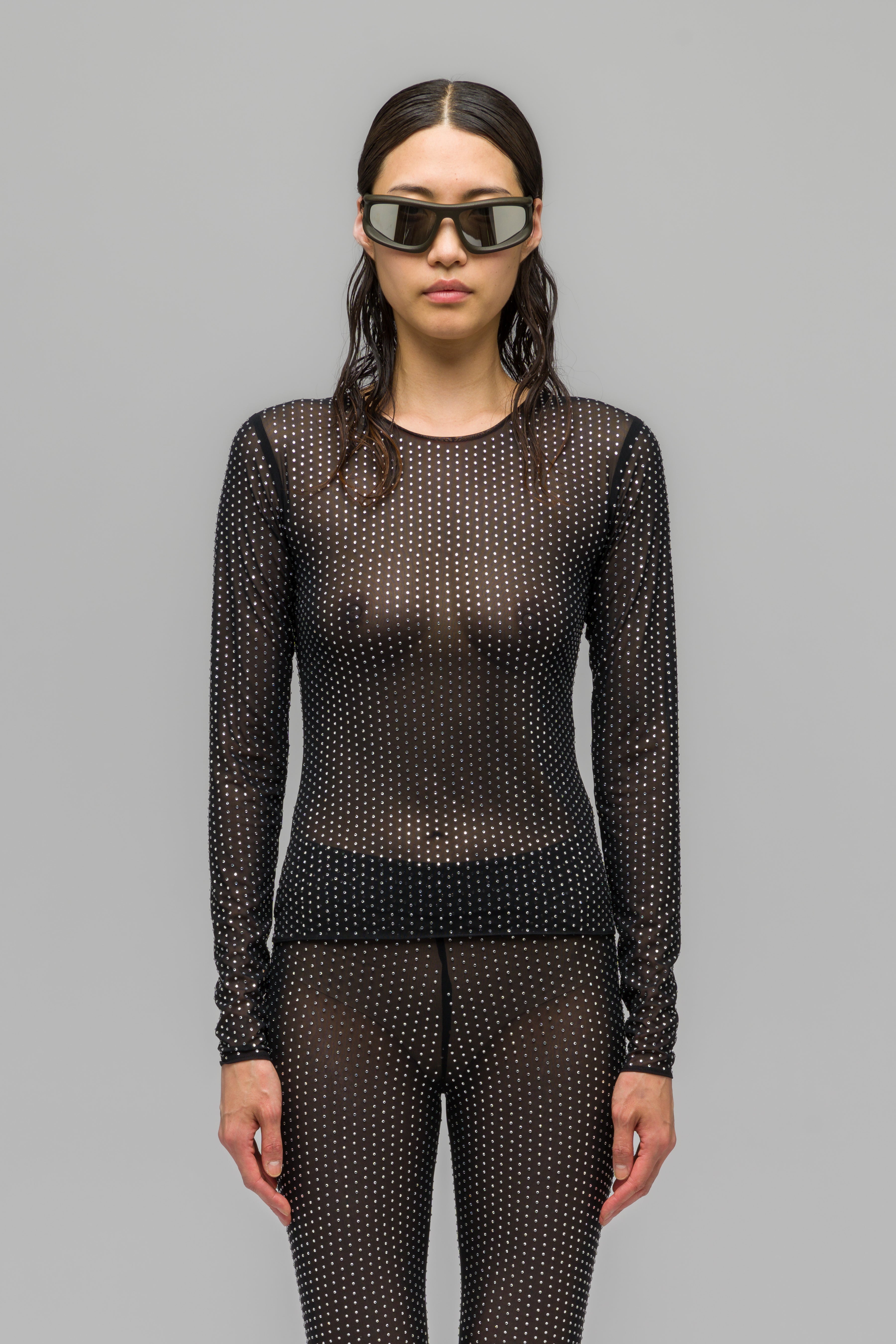 Tight fitted mesh longsleeve, equipped with a delicate all over rhinestone application.