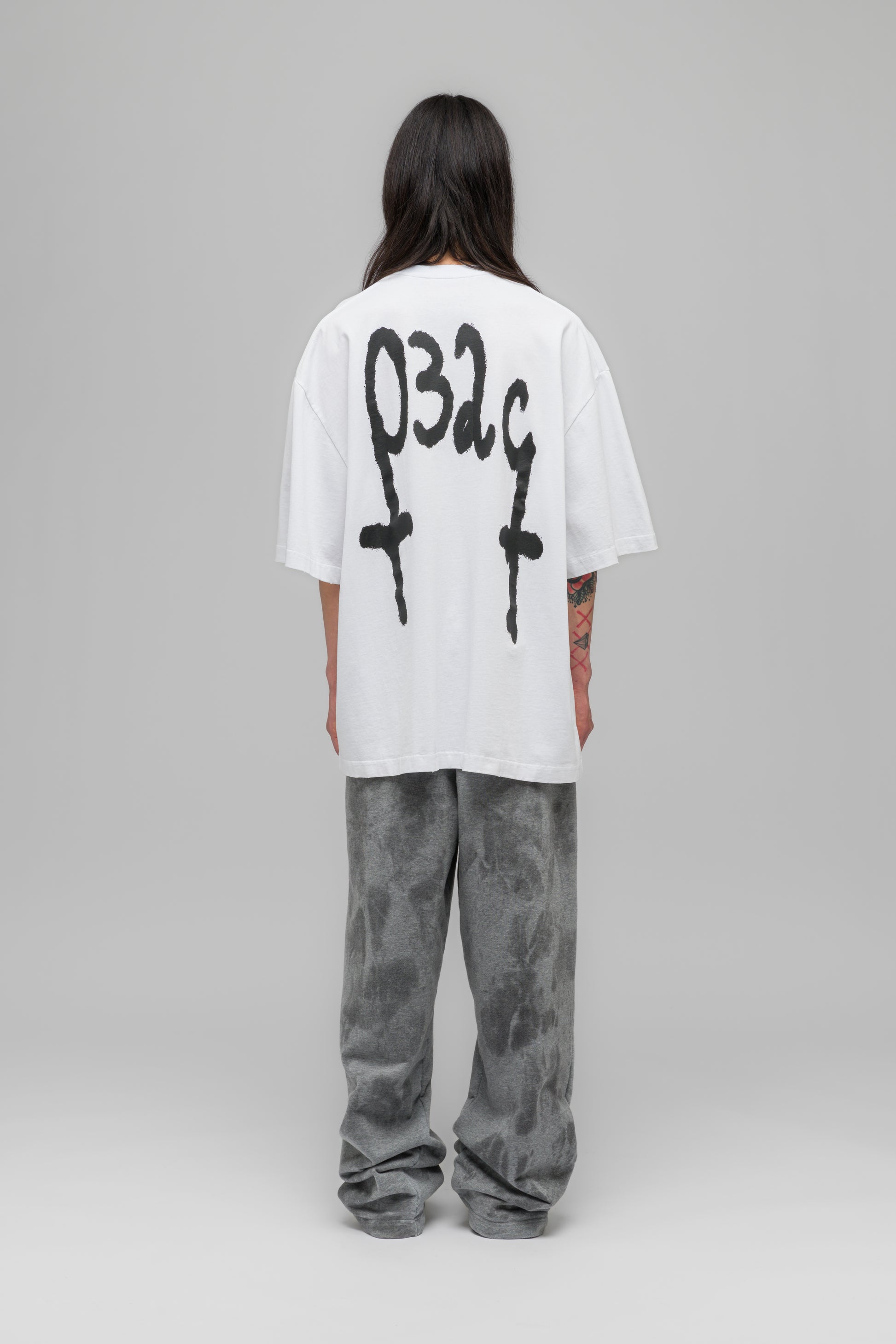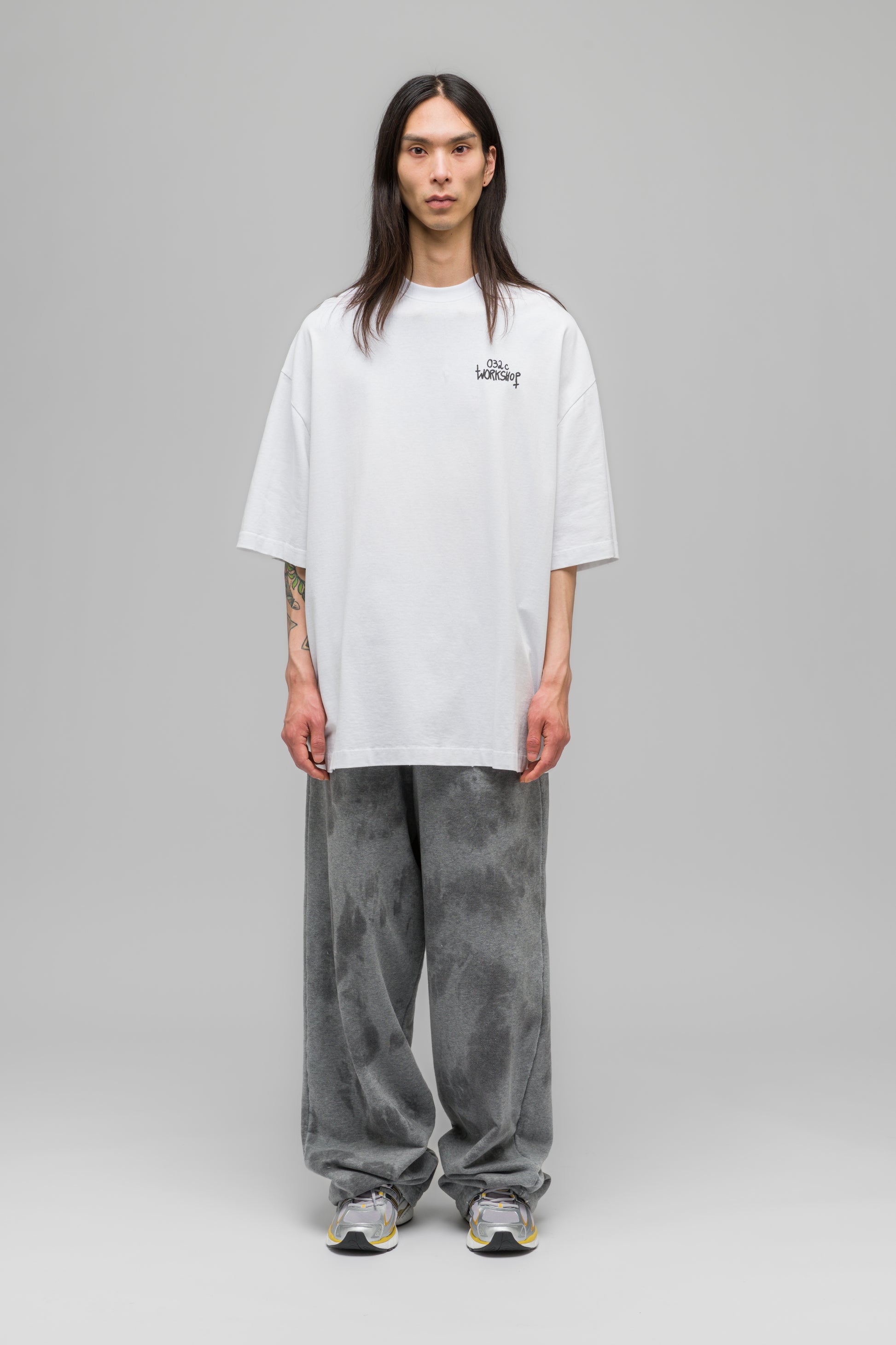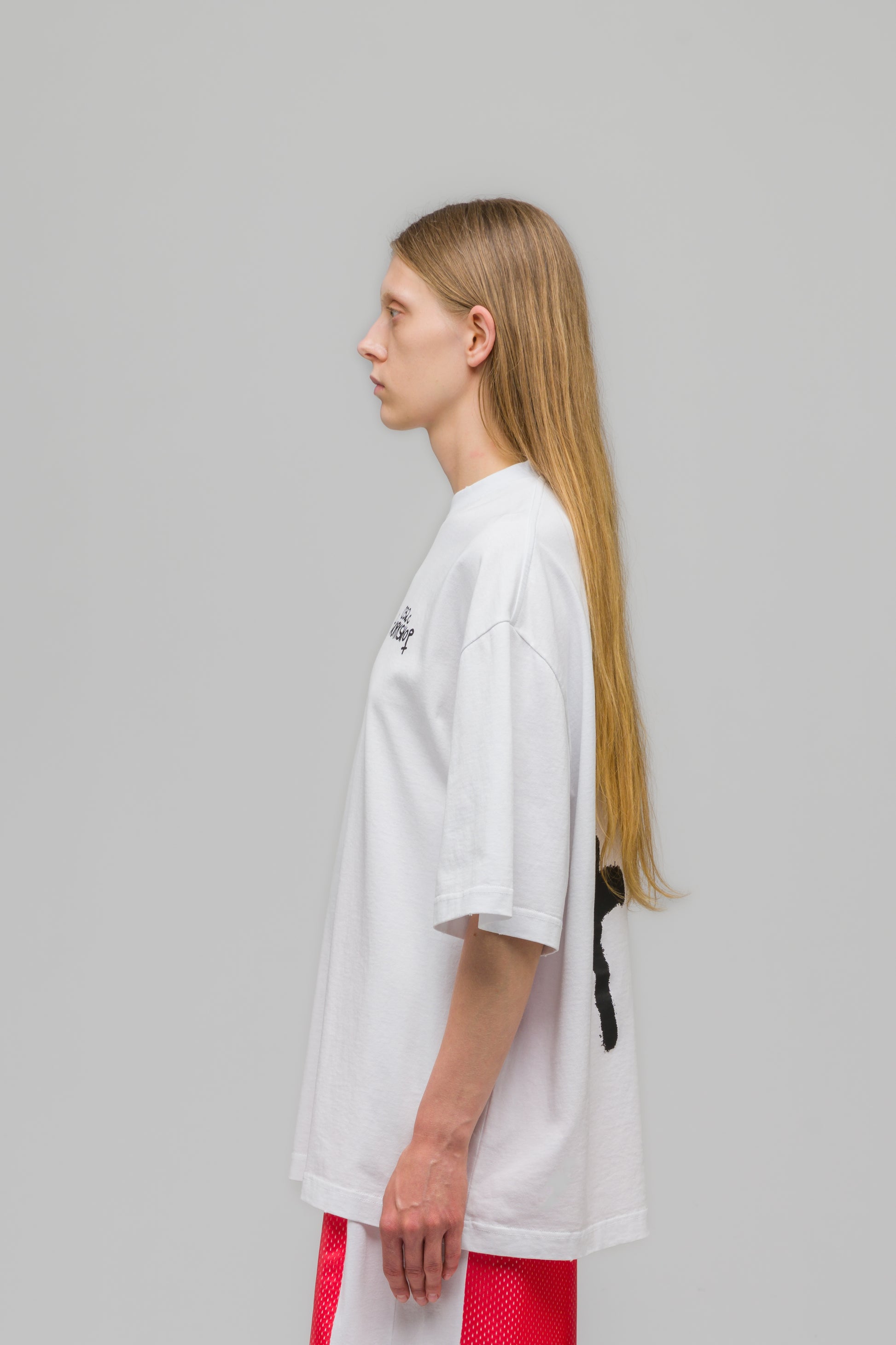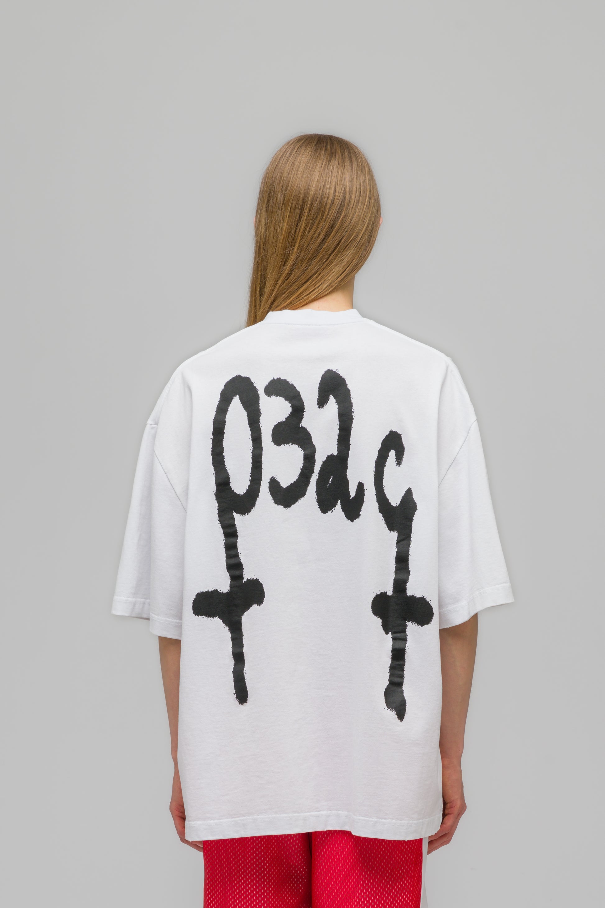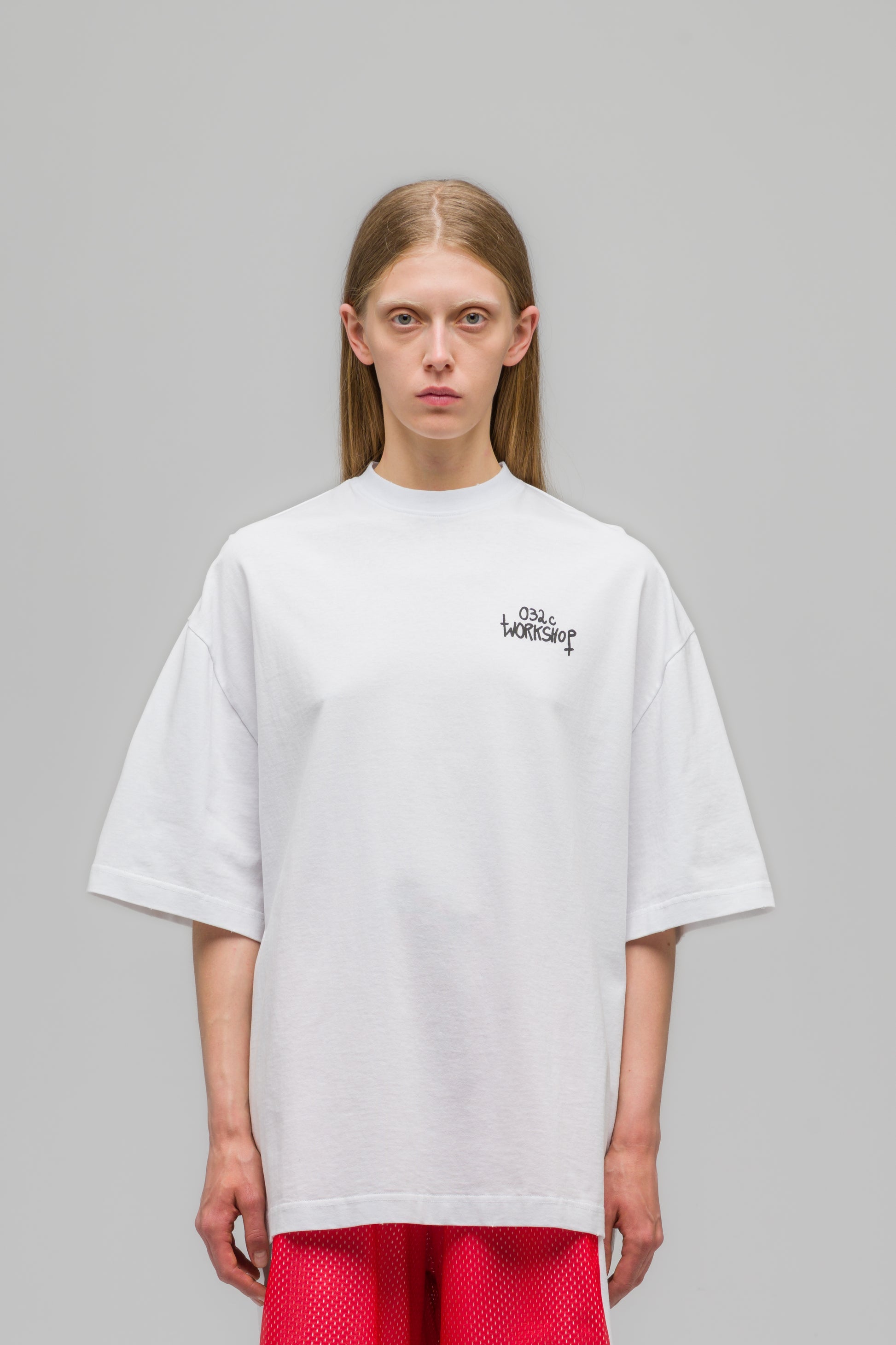 Our new oversized fitted t-shirt for a more impactful look in optic white, equipped with a black seasonal 032c logo screenprint on front and back.