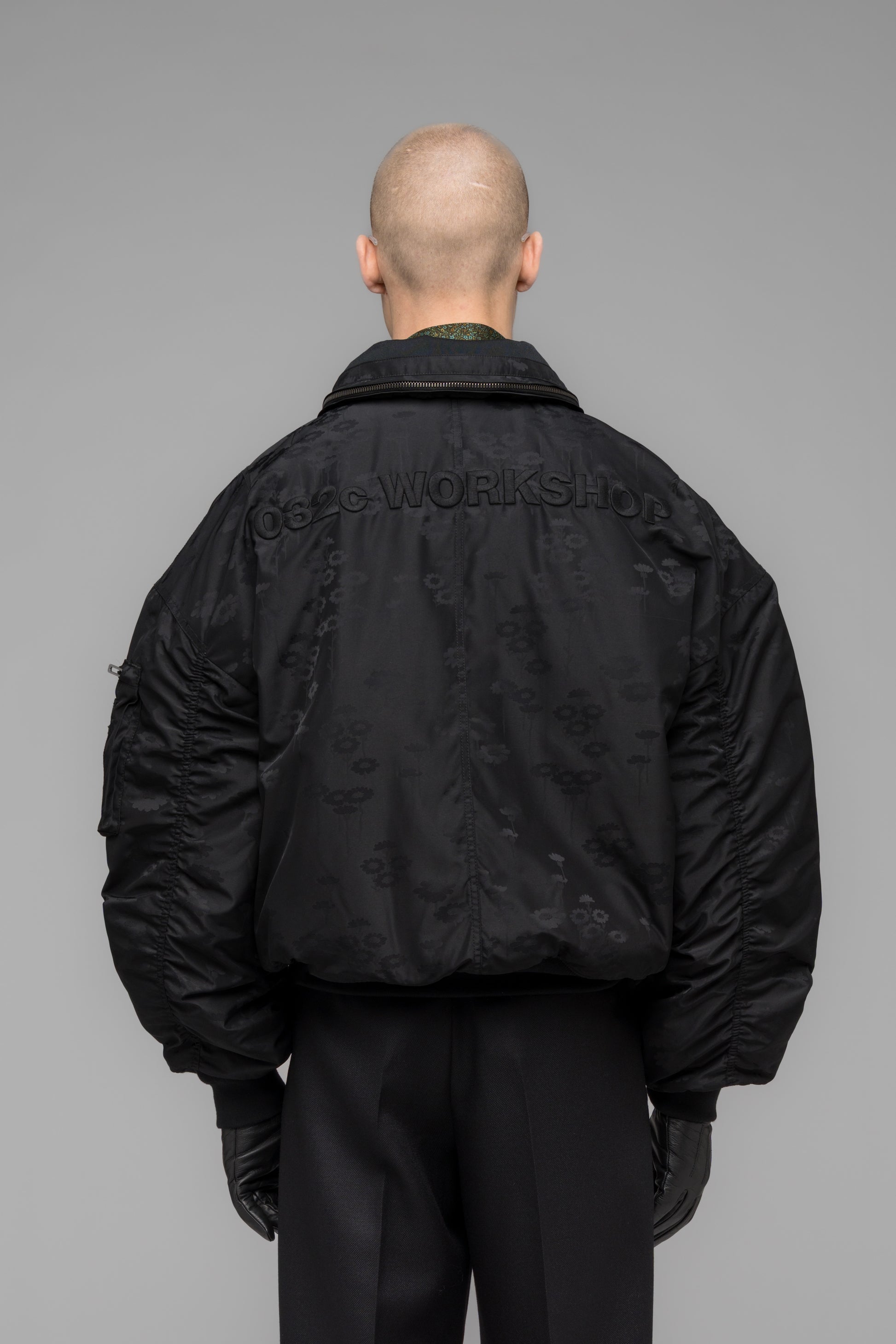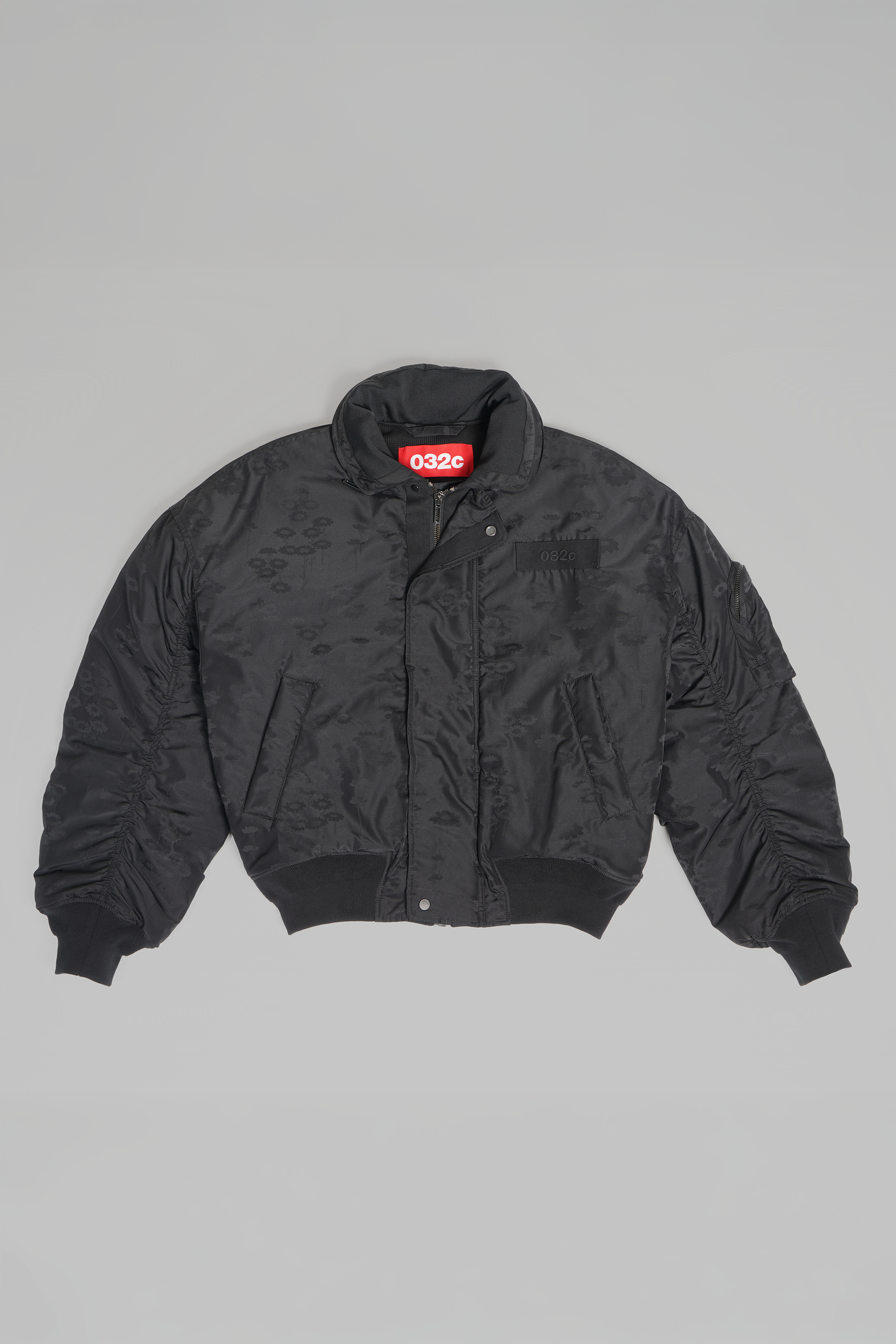 Relaxed-fit bomber jacket in custom jacquard nylon with an all-over “Melting Daisies” pattern and water-repellent finish. Fully padded and lined, it features welt side pockets, sleeve patch pocket, multifunctional collar with hidden hood, ribbed collar and cuffs with thumb holes, branded zip puller, and 3D embroidered 032c Workshop logo on the back.