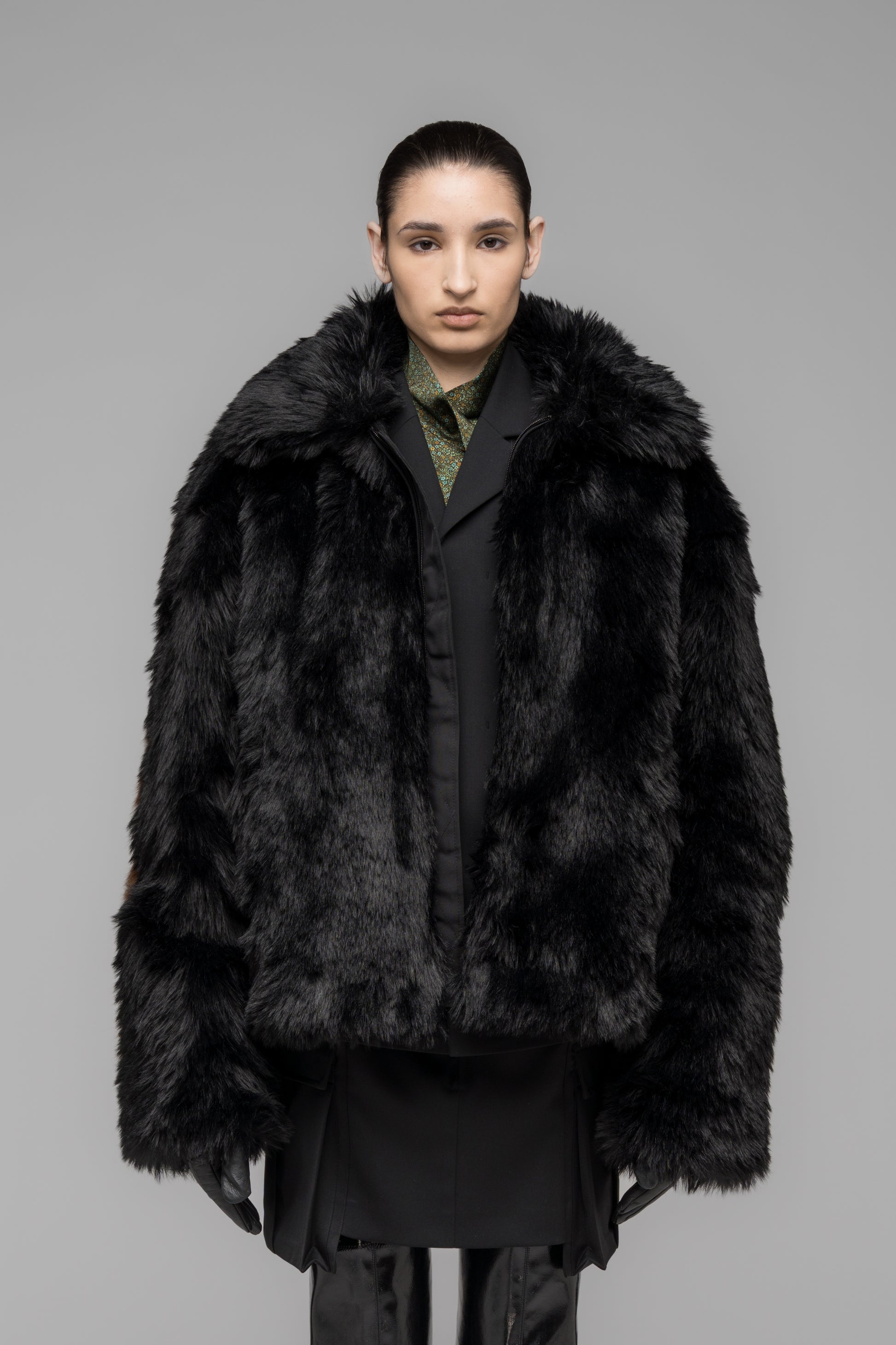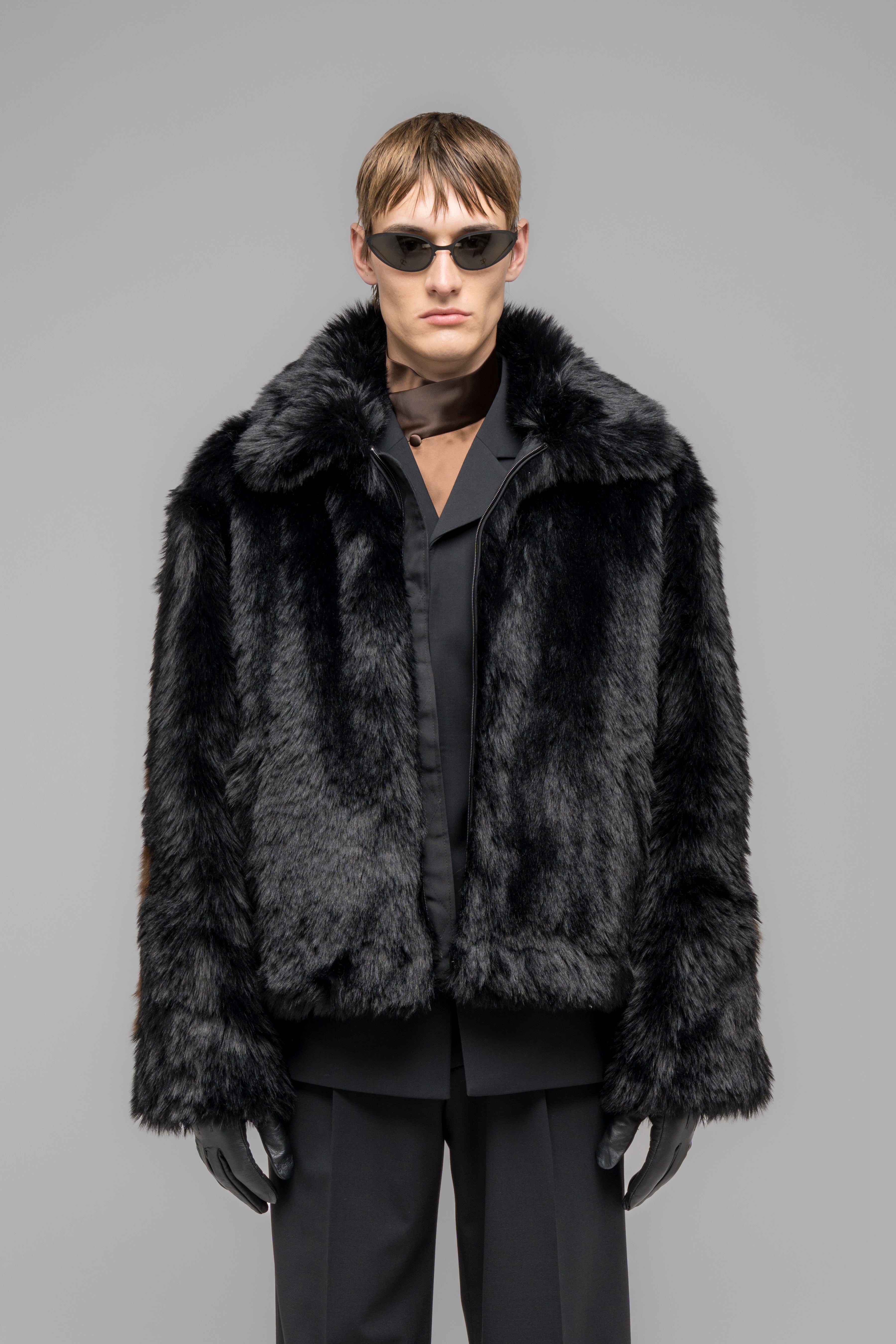 Oversized faux fur blouson with concealed zip closure, side welt pockets, and an intarsia “032c Workshop” logo on the back.