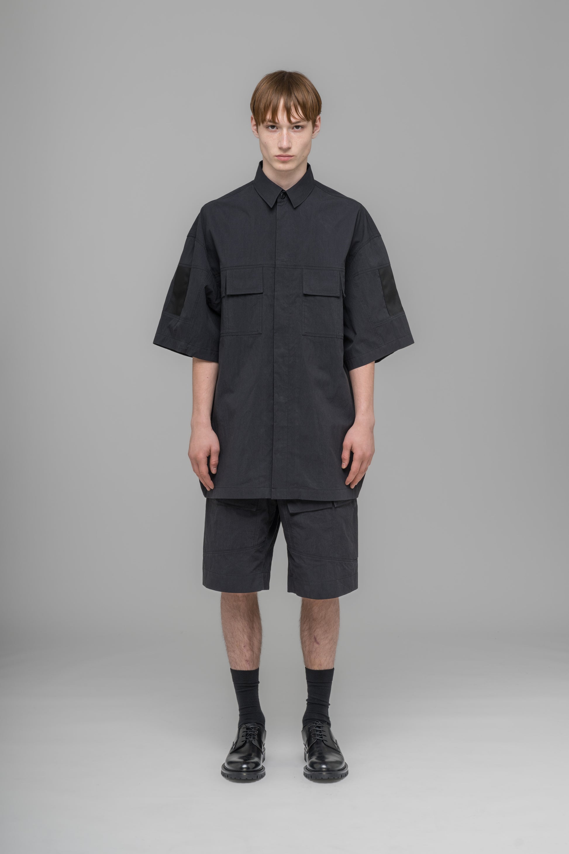 Utility-style shirt with Velcro-flap patch pockets and velcro adjusters inserted into side seam. The shirt features a contrast technical fabric on the sleeves and a center-front closure with concealed, sewn-on buttons.