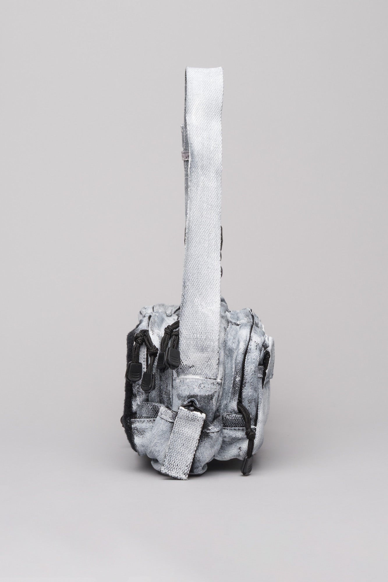 Shoulder bag in chalky-white painted black canvas with multiple pockets and Velcro details, featuring an adjustable strap and removable Velcro patch for adaptable stylin
