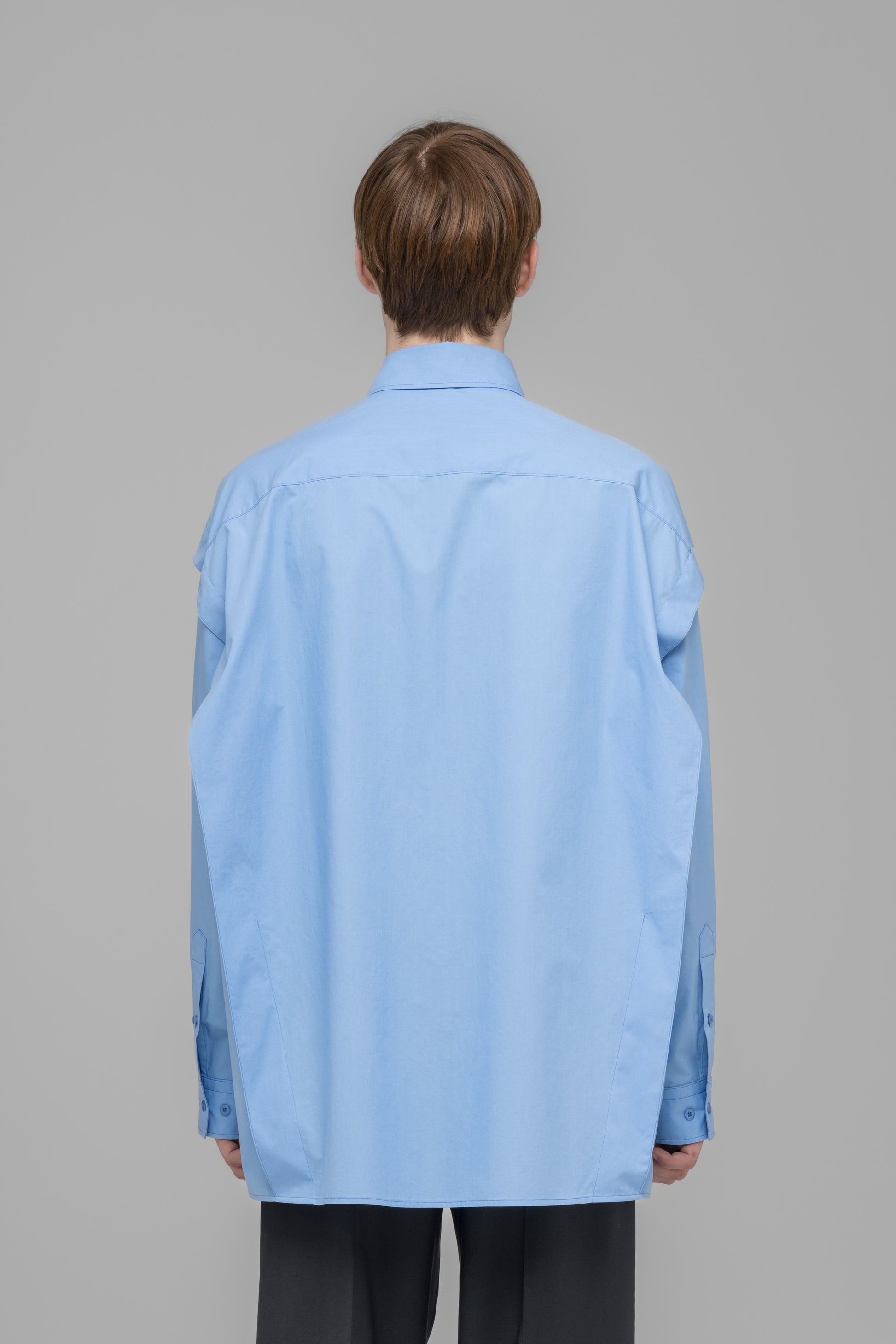 Oversized shirt with broad shoulders, now constructed with a pin-tuck action back. A front closure with concealed sewn-on buttons. Paired with a black 032c logo embroidery on the front.