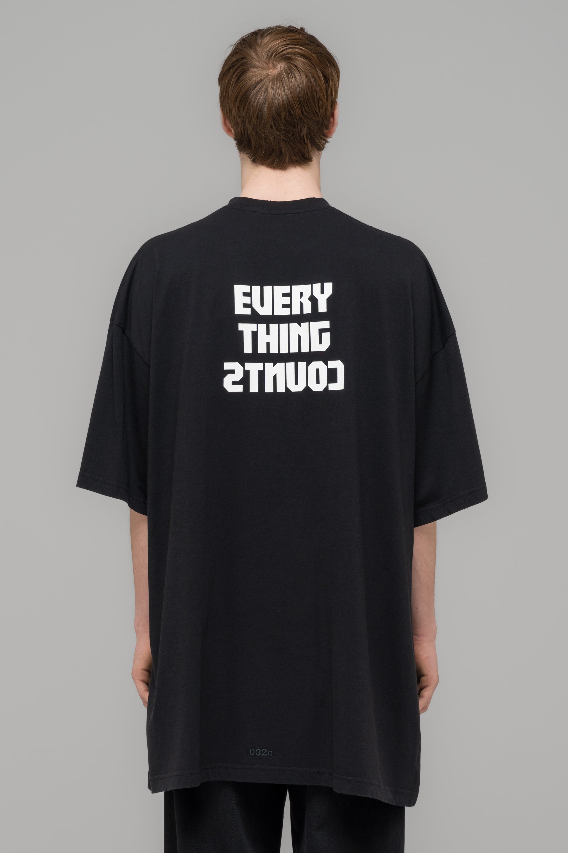 An oversized t-shirt equipped with distinct 032c artwork strategically placed on the front and back. Comes in a faded black and distressing, for a vintage feel.