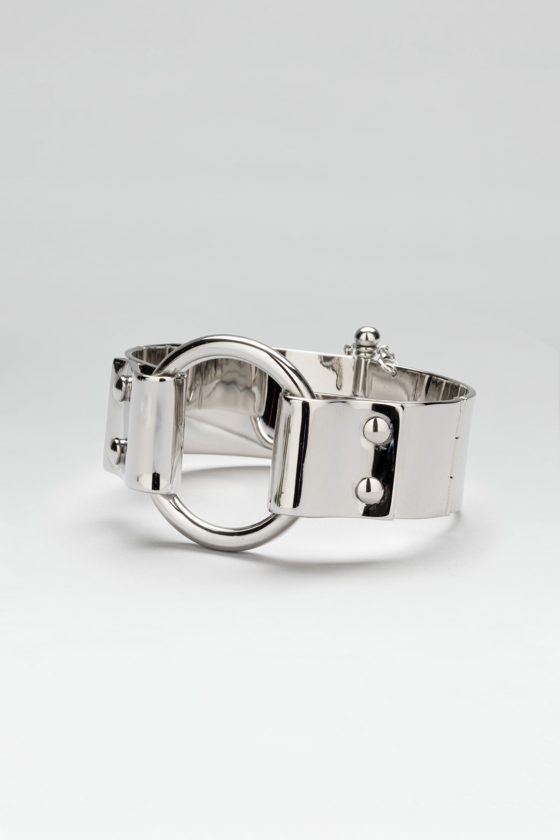 High shine silver metal ring bracelet with a metal pin & chain closure at the back. LOVE, 032c debossed logo branding.