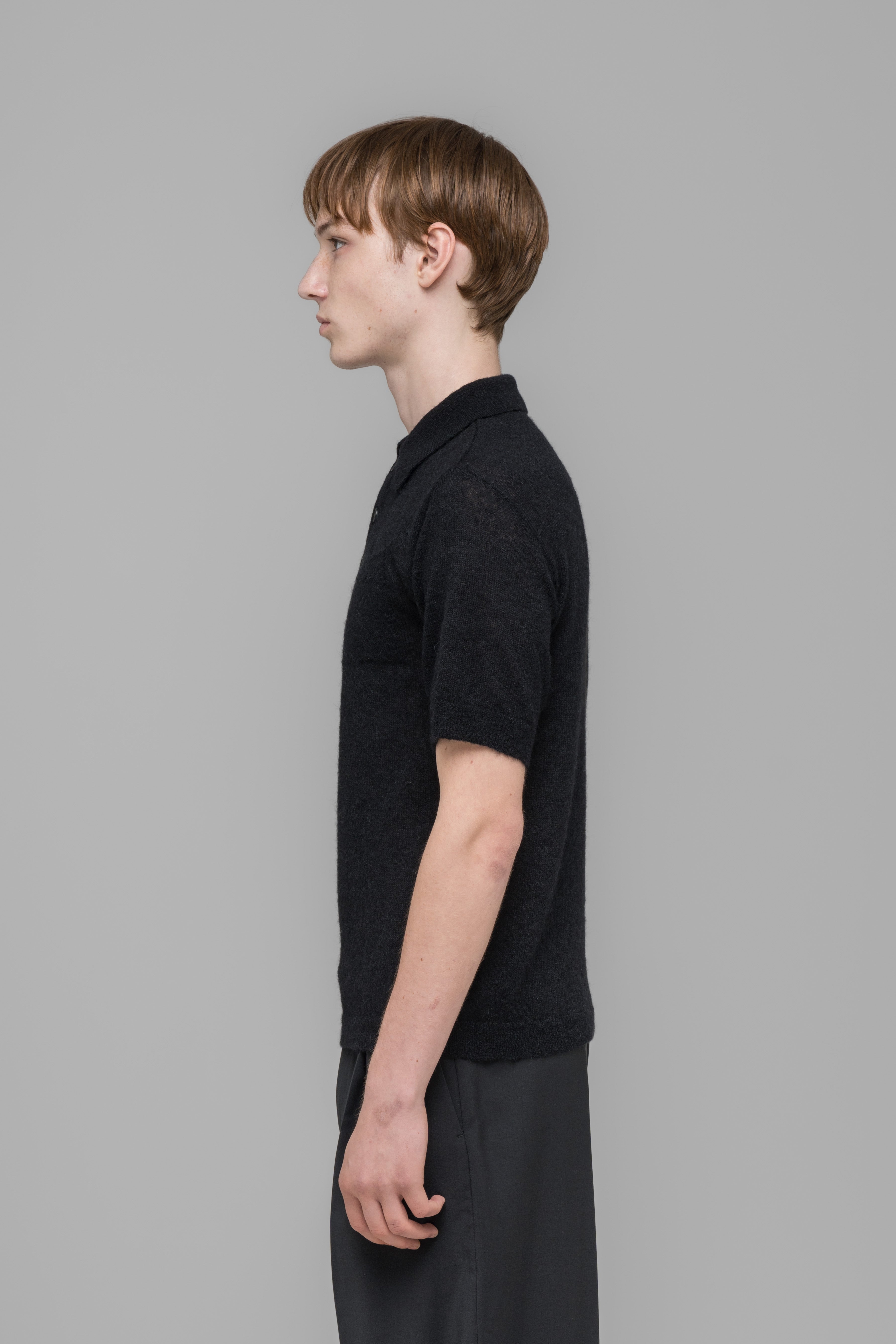 Lightweight polo shirt in fluffy alpaca knit with airy transparency, featuring a patch pocket and 032c-branded coin buttons.