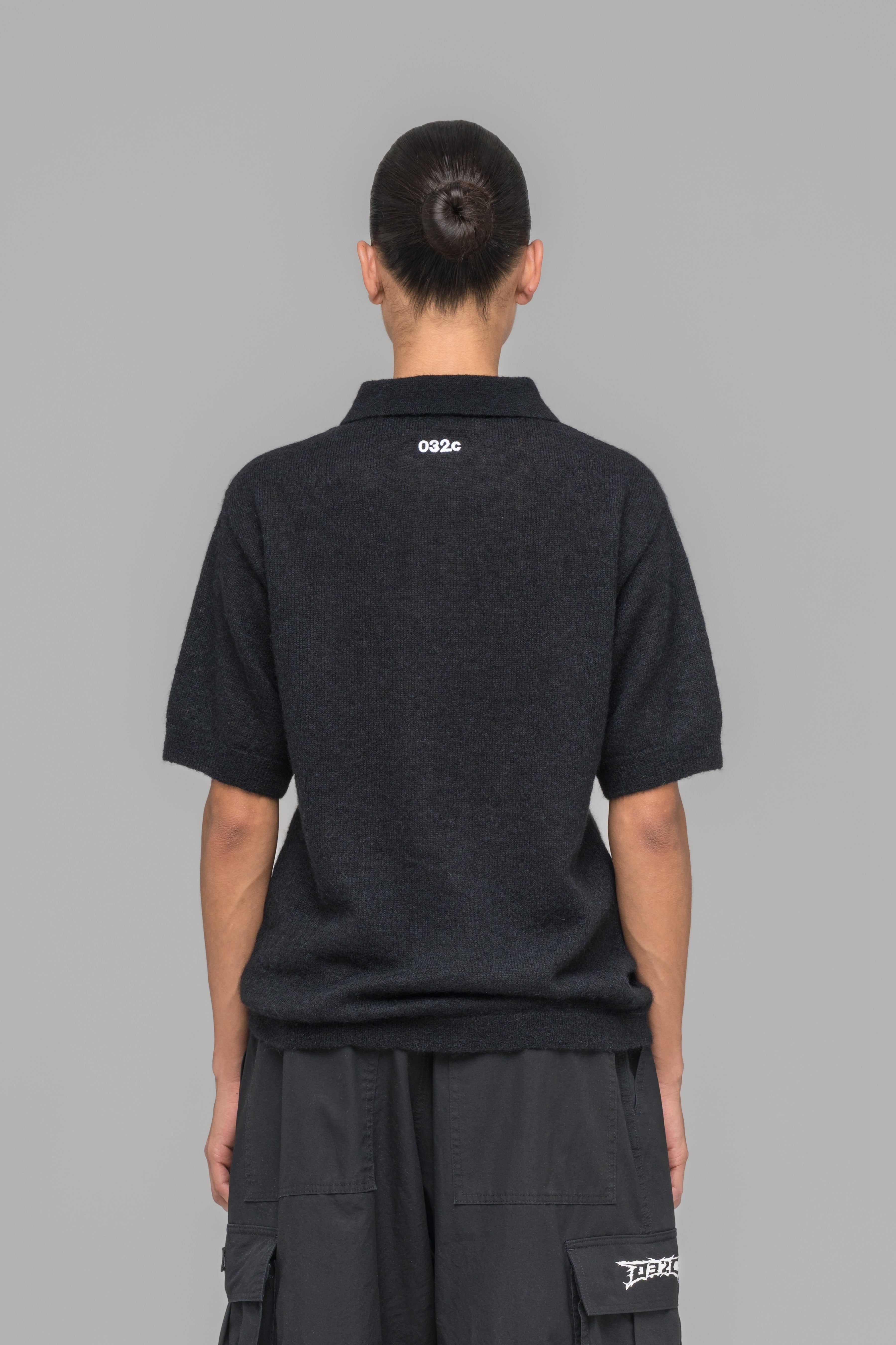 Lightweight polo shirt in fluffy alpaca knit with airy transparency, featuring a patch pocket and 032c-branded coin buttons.