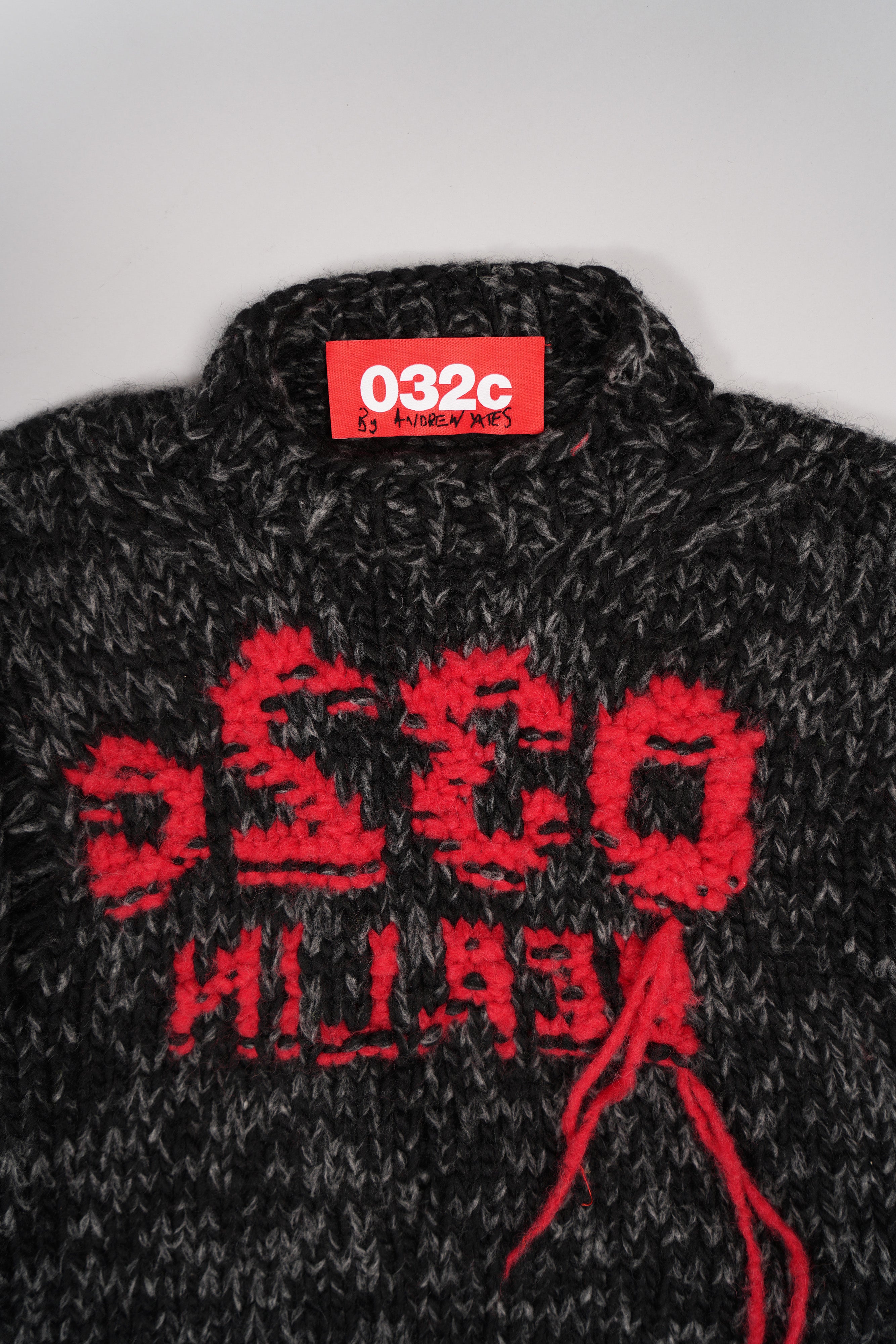 Working with found yarns, Andrew mixes materials to create a new yarn with a mouliné appearance. Dropped stitch laddering and hanging threads introduce a slightly distressed texture, while the 032c logo appears in its classic red—partially unreadable, with a raw, punk energy. The texture recalls the static of old television screens from the 1990s, referencing a time before social media.