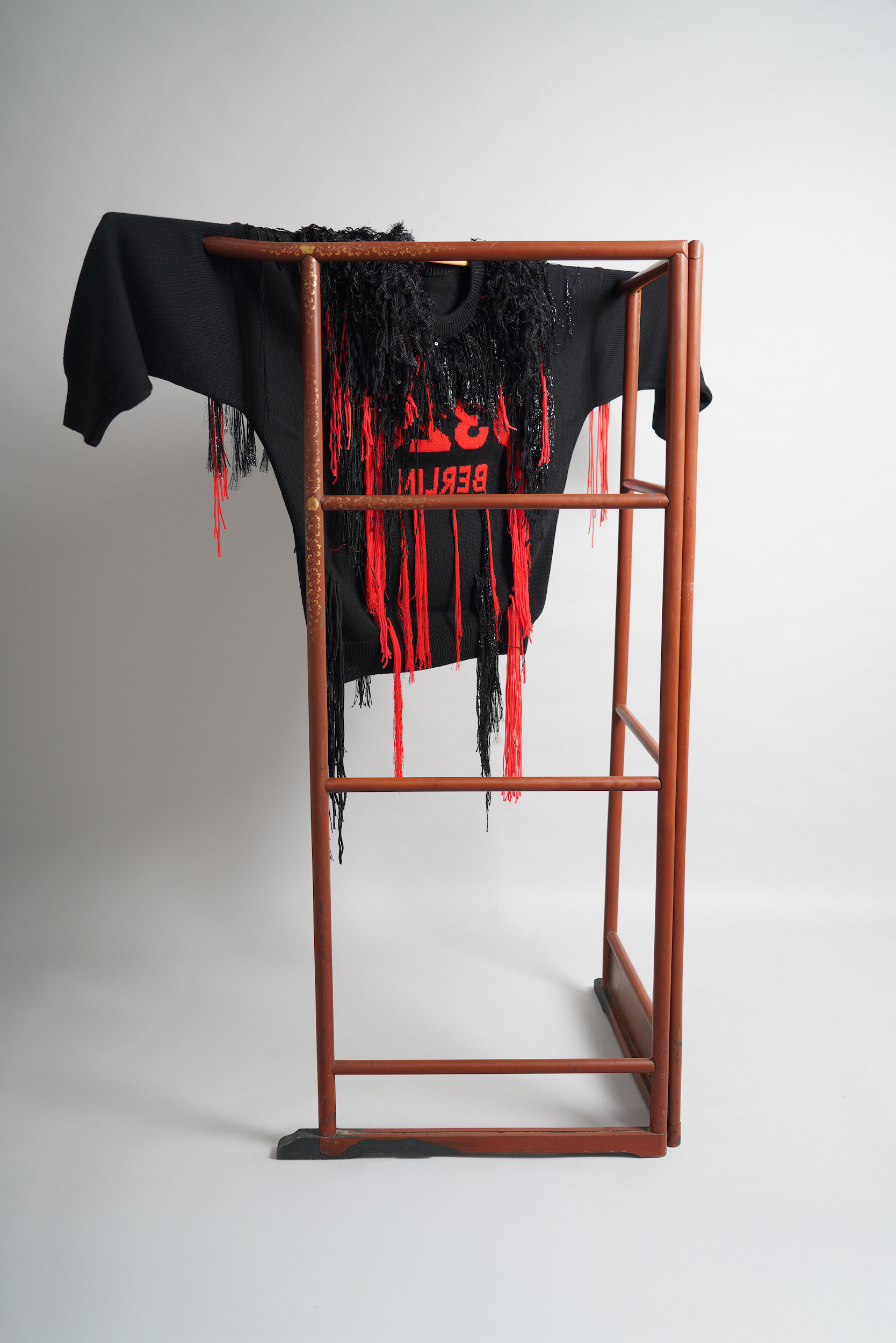 THE OTHER GODS reimagine the iconic 032c Selfie Sweater through their signature fringe technique. Working with the original sweater as a base, the duo hand-applies multiple yarns—merino wool, viscose, silk, sequins, and lurex—in calibrated lengths. The result is a sculptural, cascading surface that blurs the line between garment and textile art.