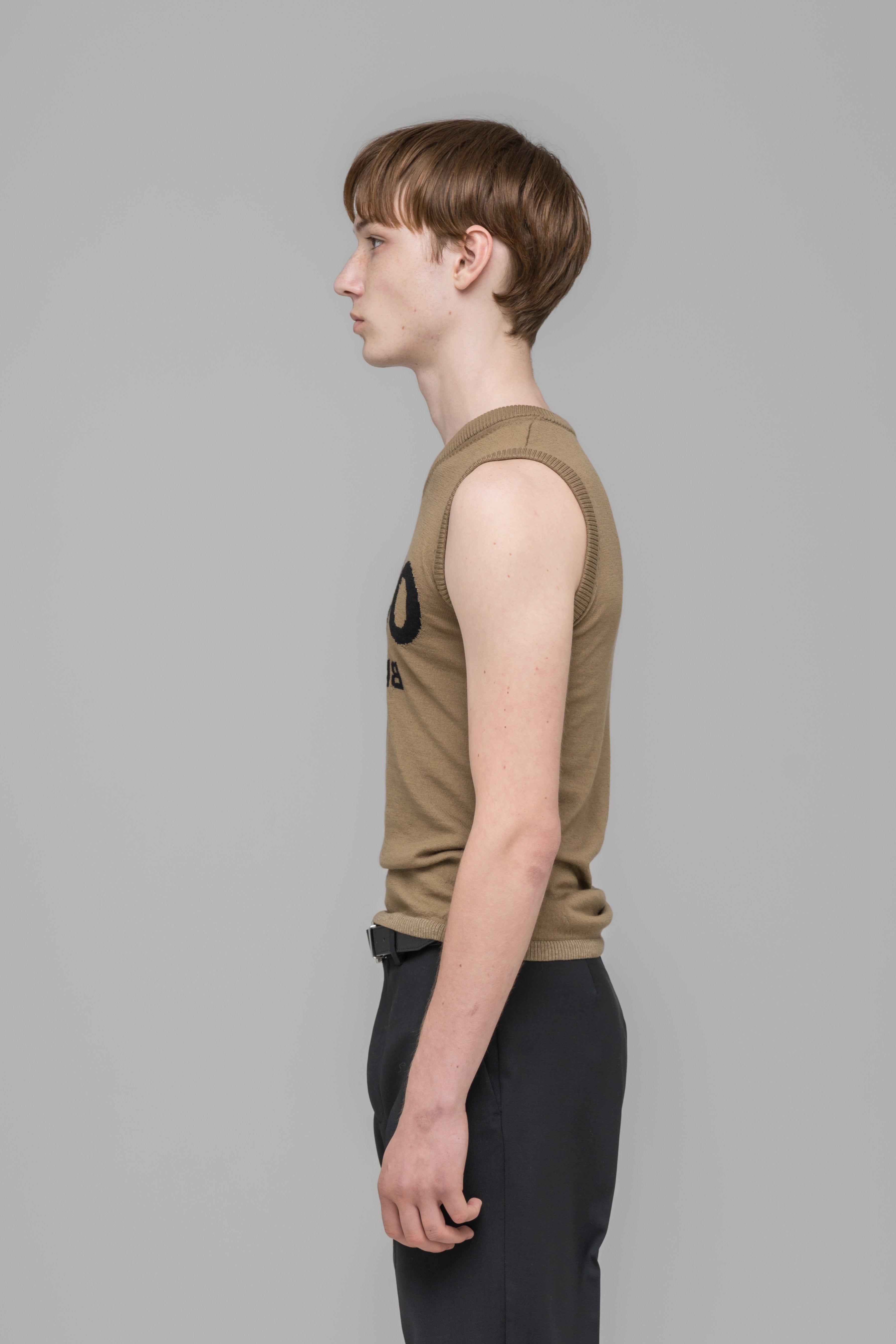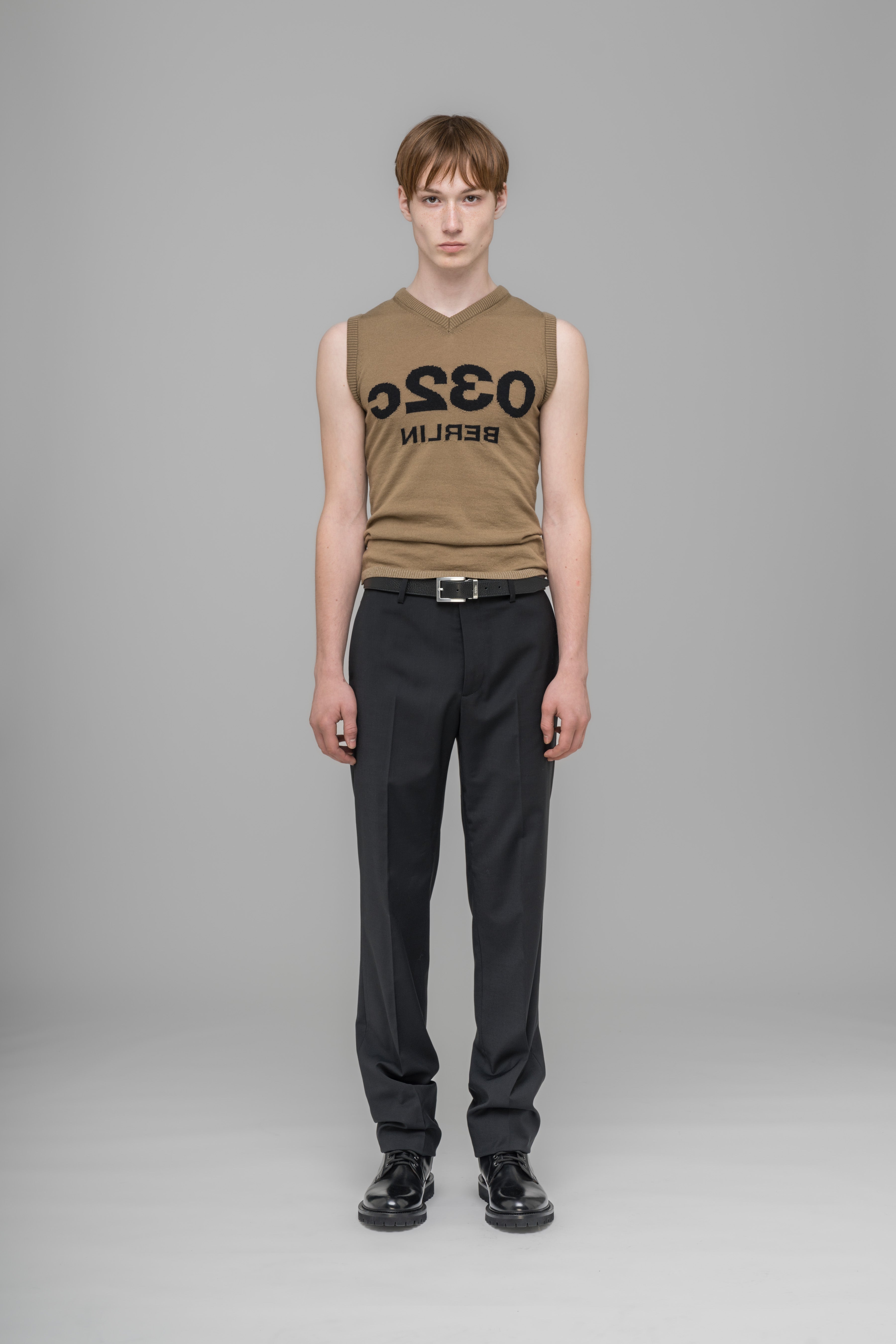 The selfie vest, made from soft merino wool, features the iconic mirrored 032c Berlin inserted jacquard artwork on the front and has ribbed armholes, neckline, and hem.