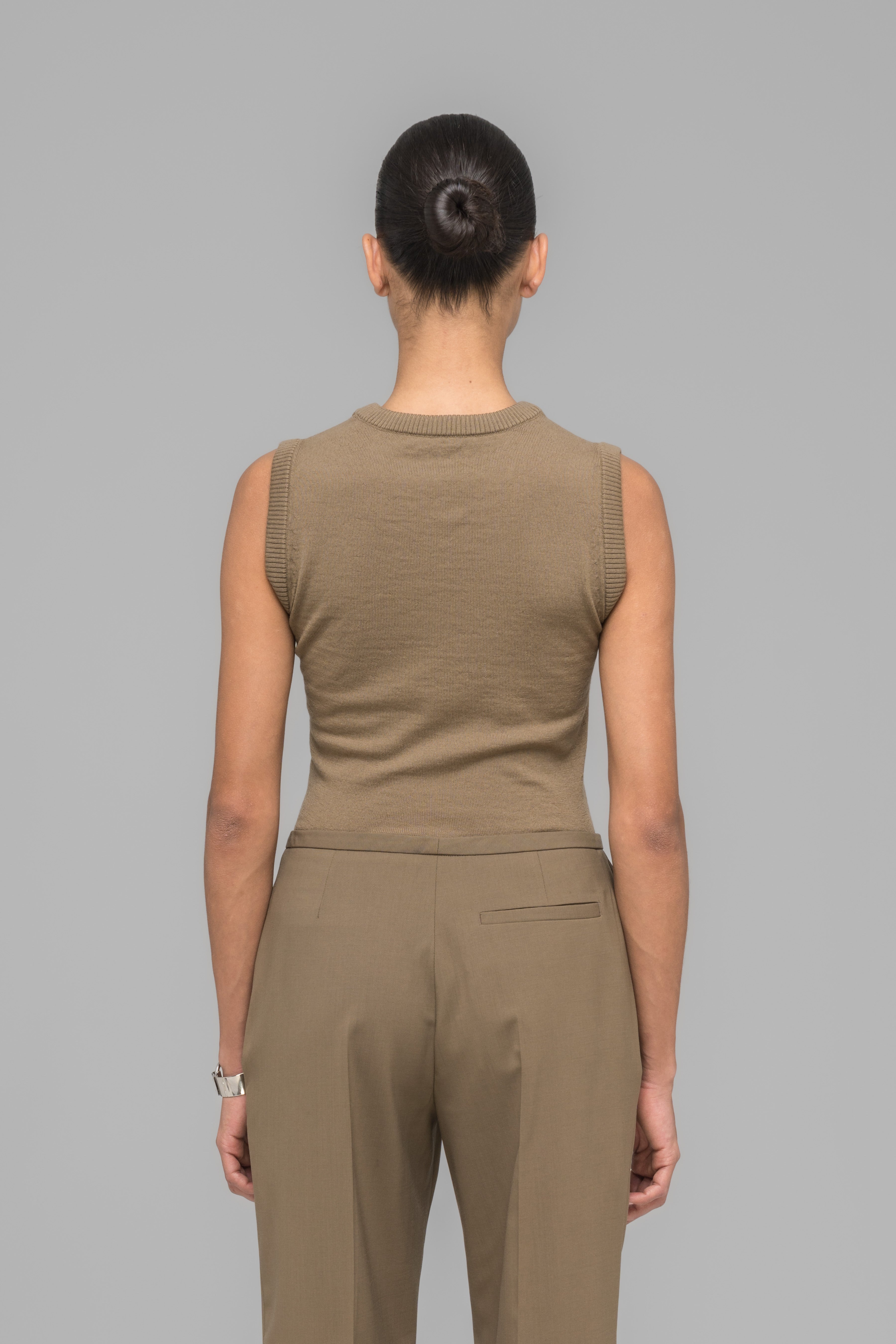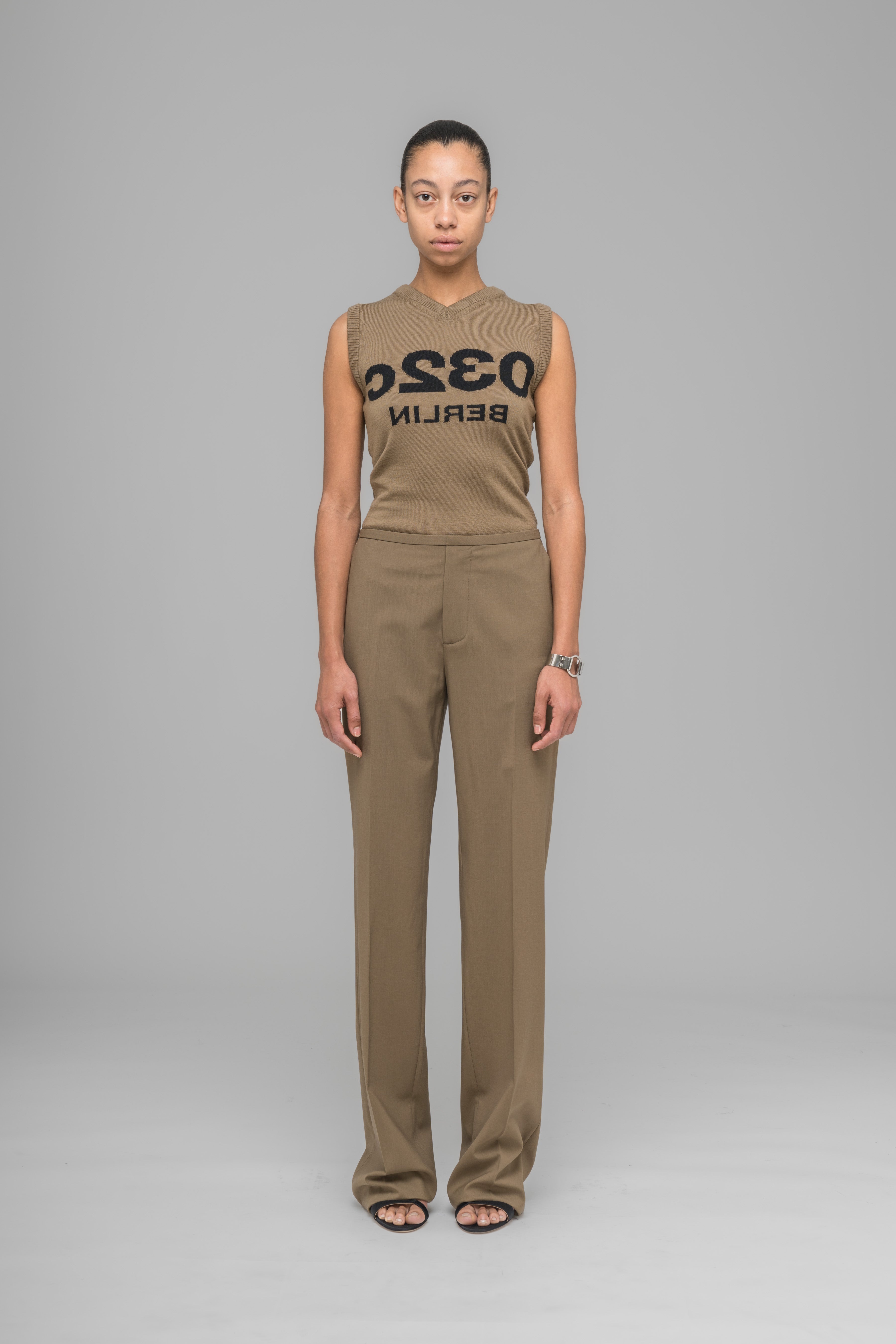 The selfie vest, made from soft merino wool, features the iconic mirrored 032c Berlin inserted jacquard artwork on the front and has ribbed armholes, neckline, and hem.
