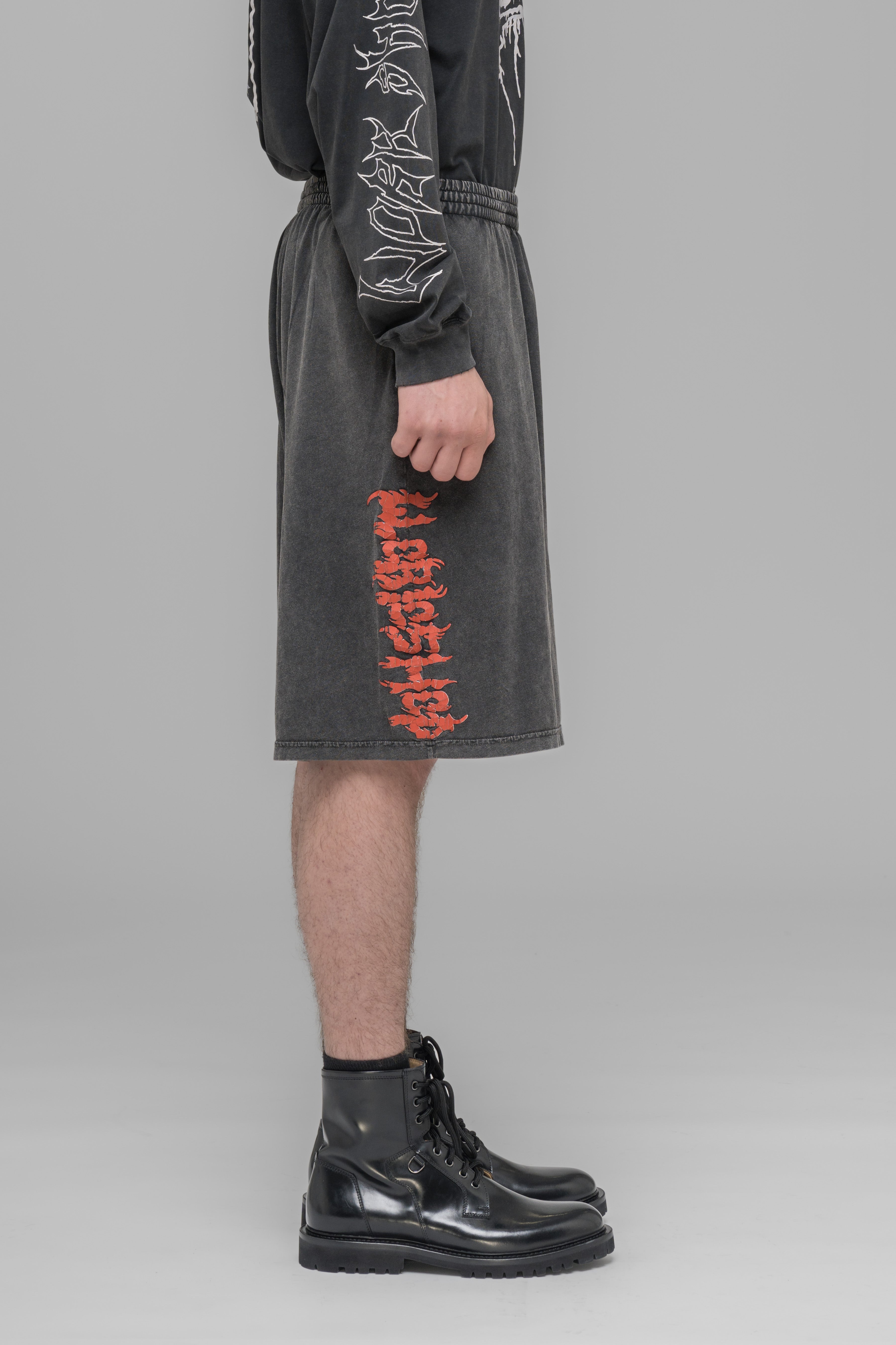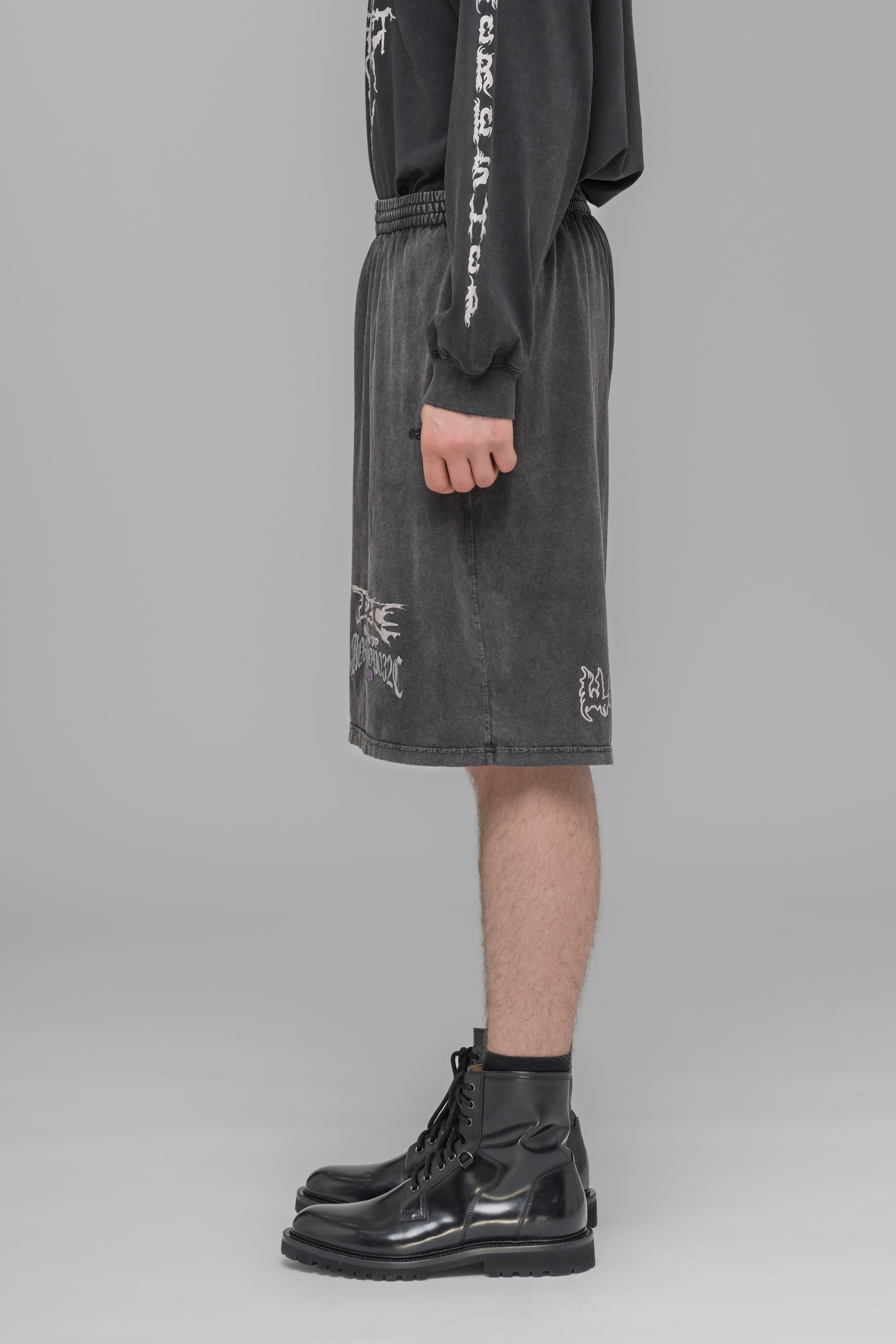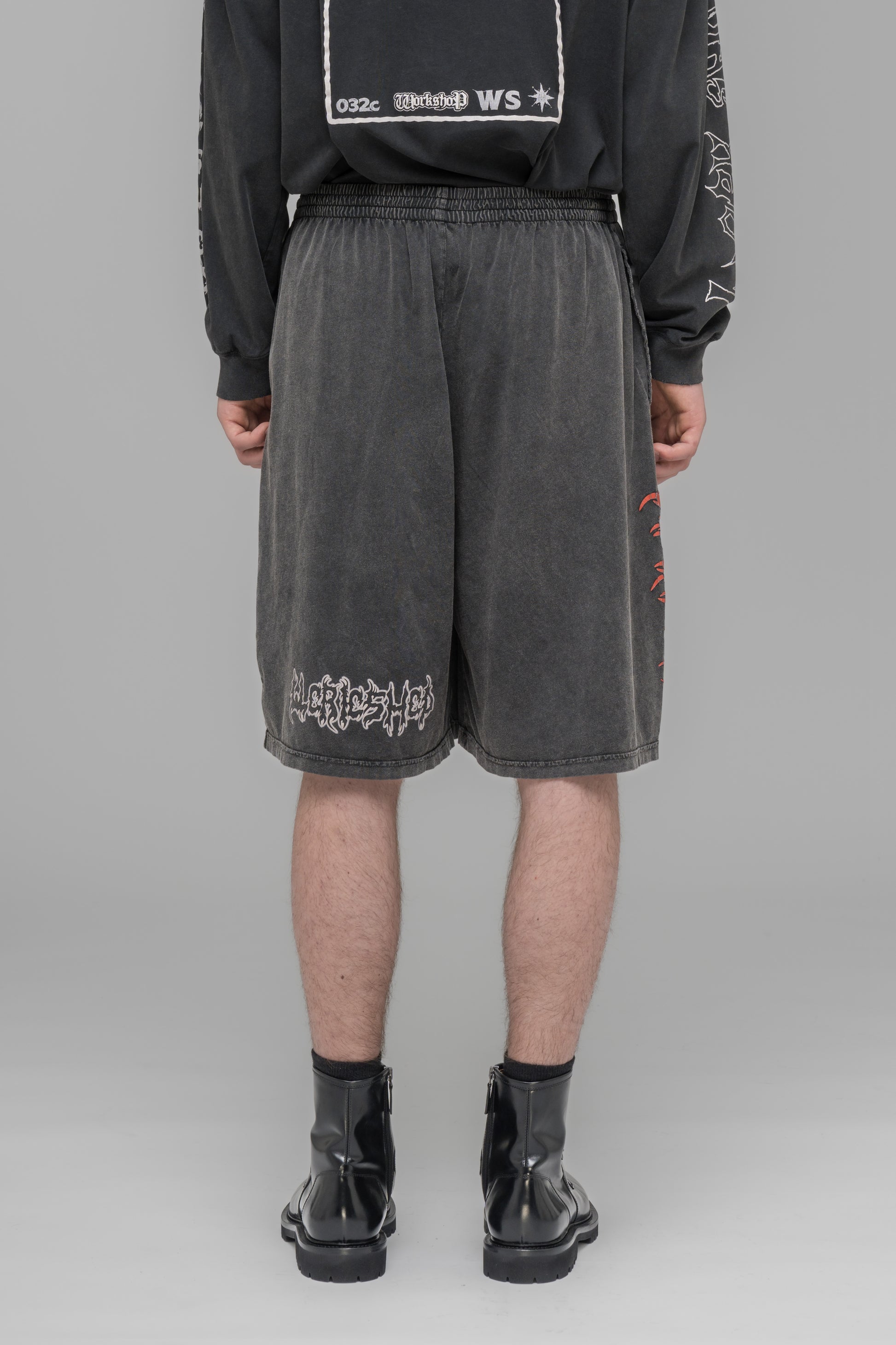Comfort shorts in faded black with a relaxed yet elevated style, featuring 032c embroidery and cracked screen-printed seasonal artworks.